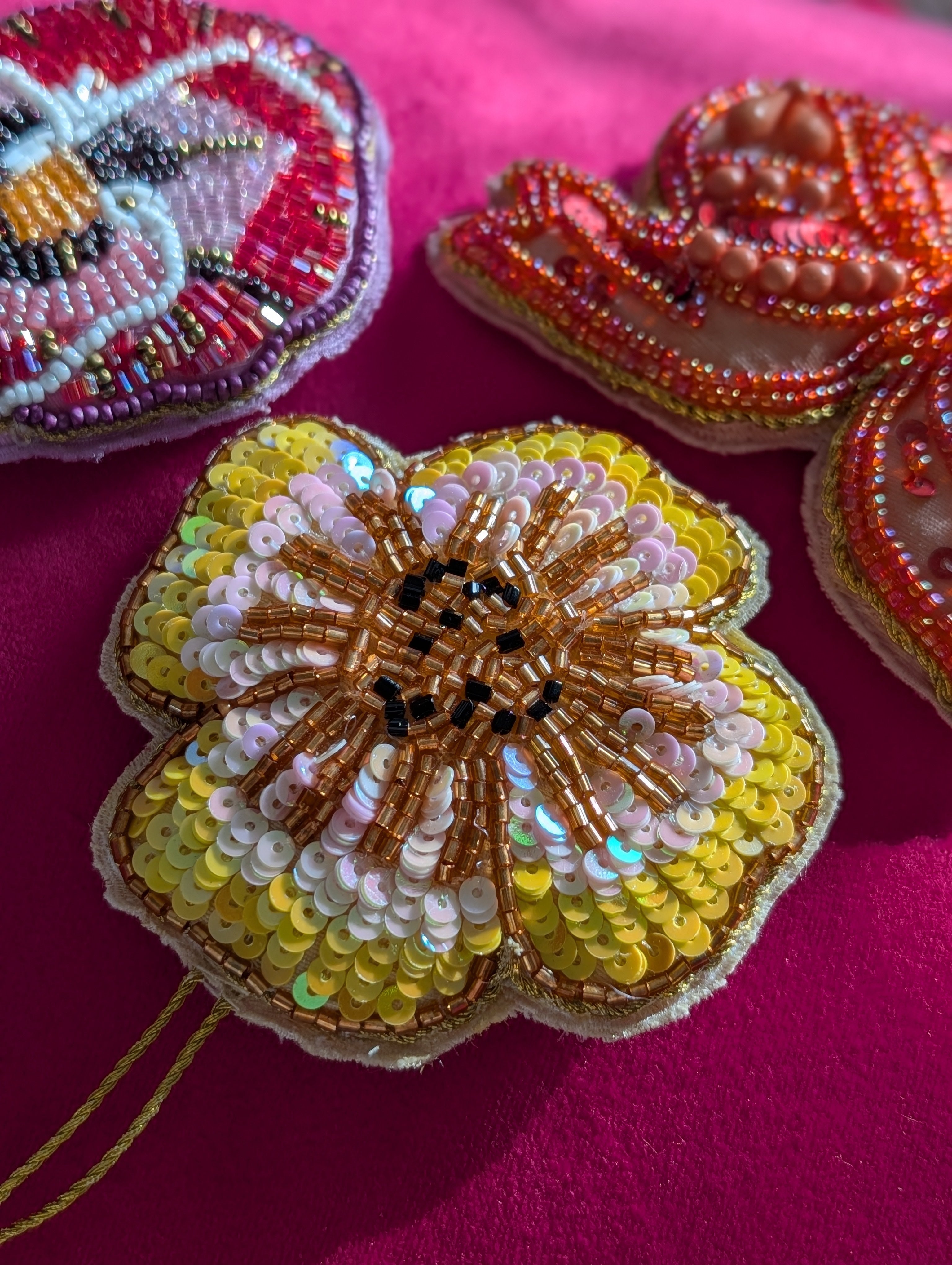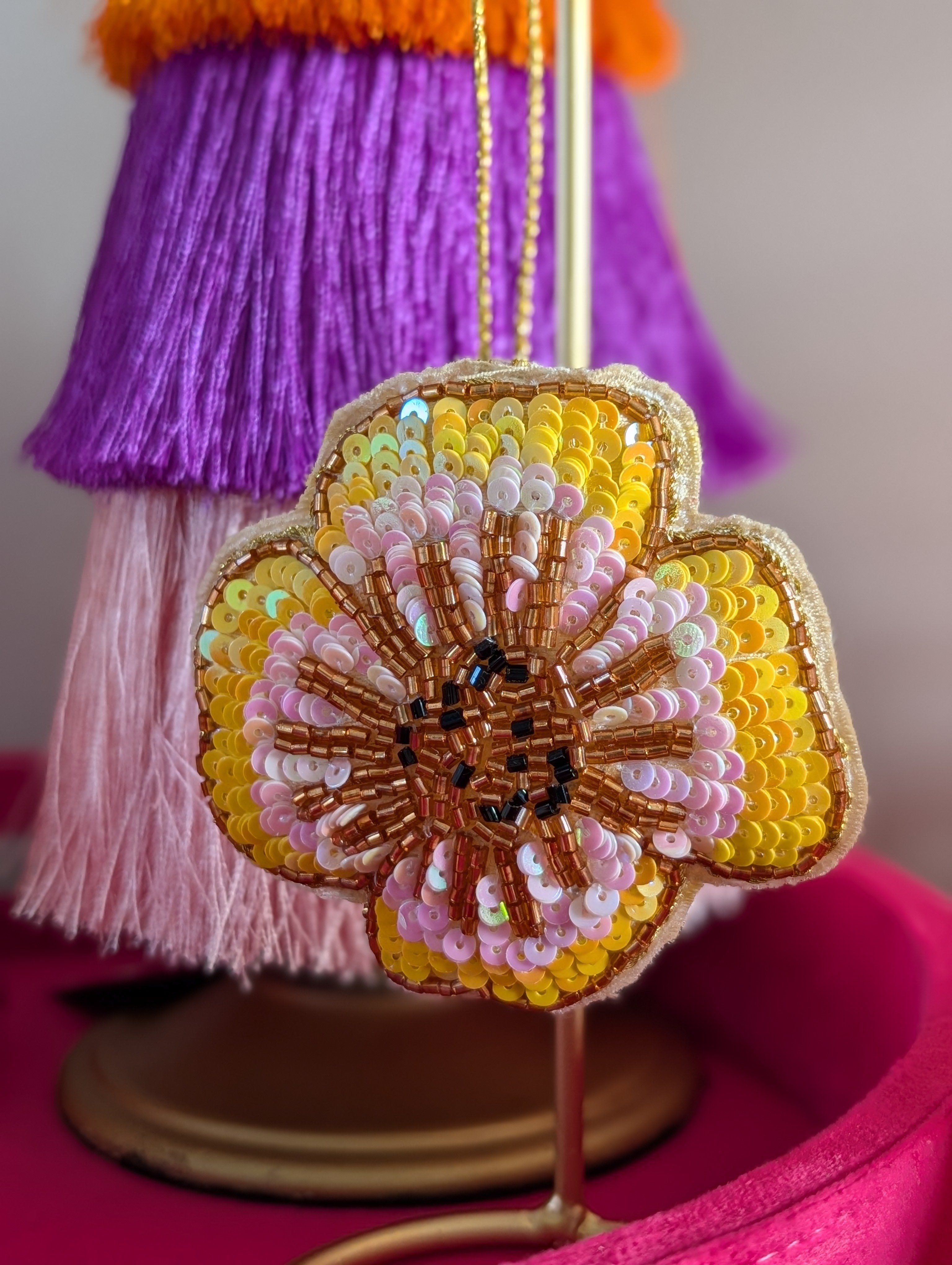 Deze prachtige handgemaakte hanger in de vorm van een bloem is een ware blikvanger. Met zorgvuldig aangebrachte kraaltjes in diverse kleuren zoals roze, gele en goudtinten, creëert hij een sprankelend en gedetailleerd design. De afmetingen van 9x9 cm maken hem ideaal als unieke decoratie. Perfect om je kerstboom een persoonlijke en artistieke touch te geven, of als een charmant cadeau voor liefhebbers van ambachtelijke decoraties.