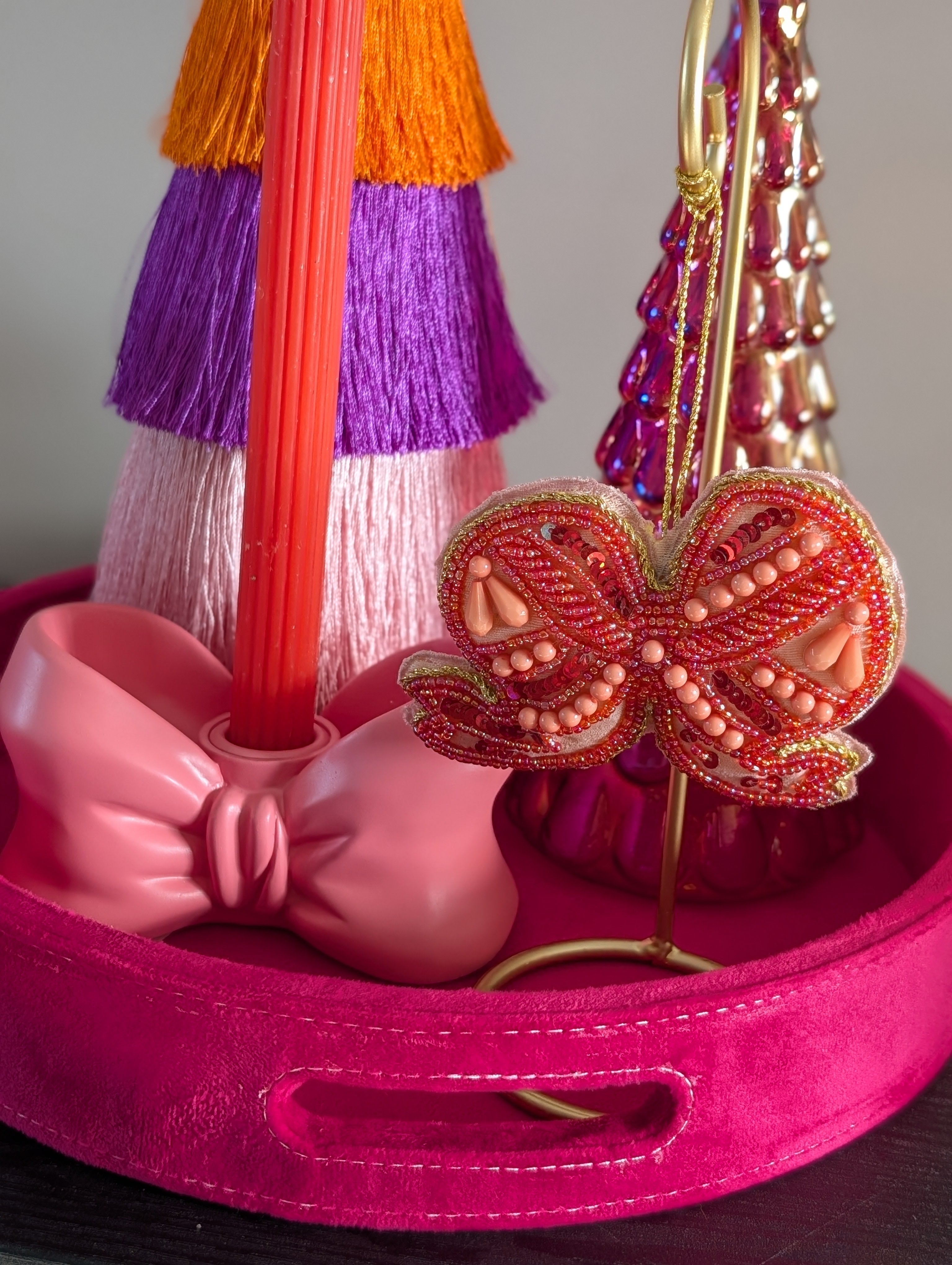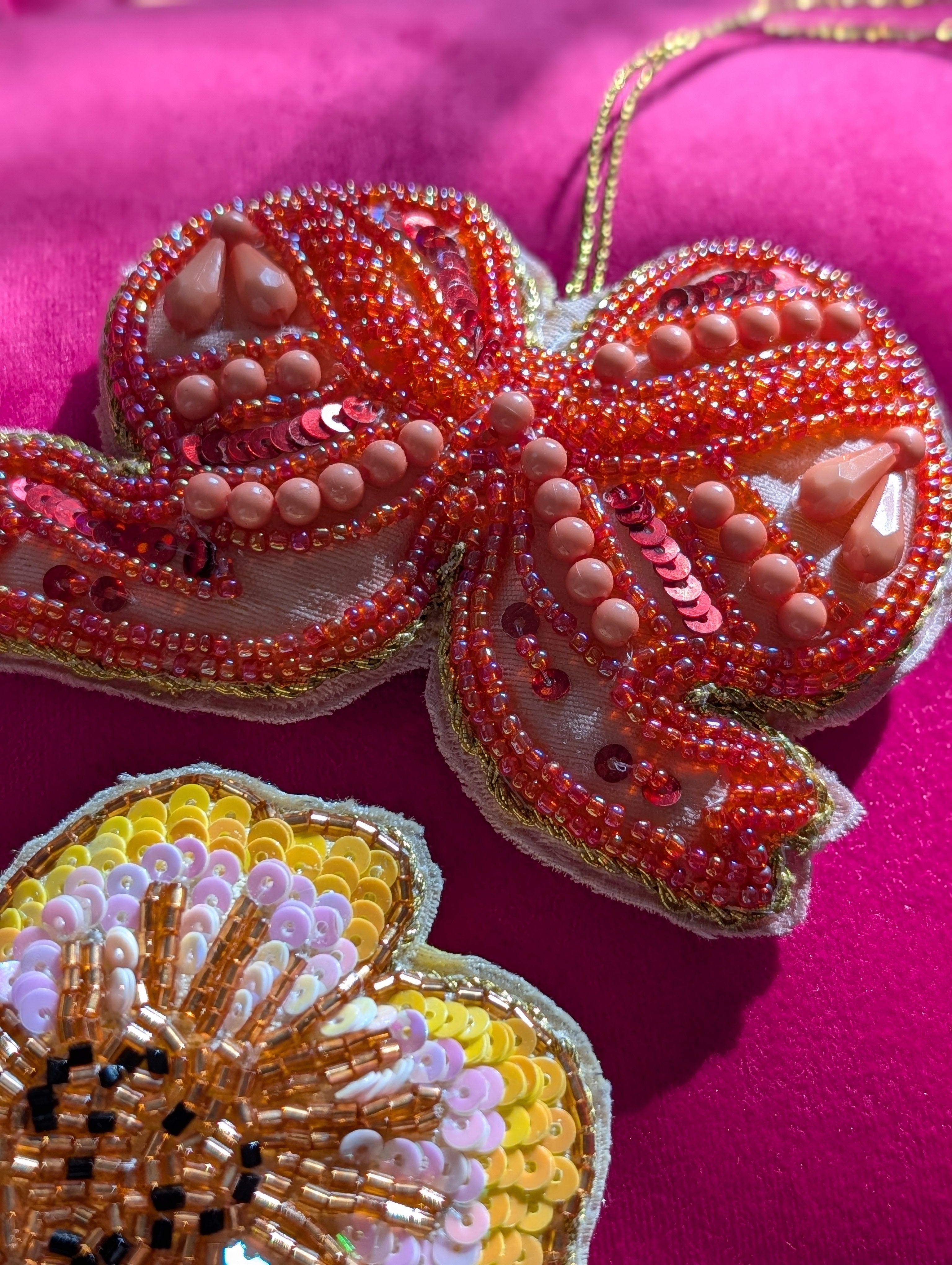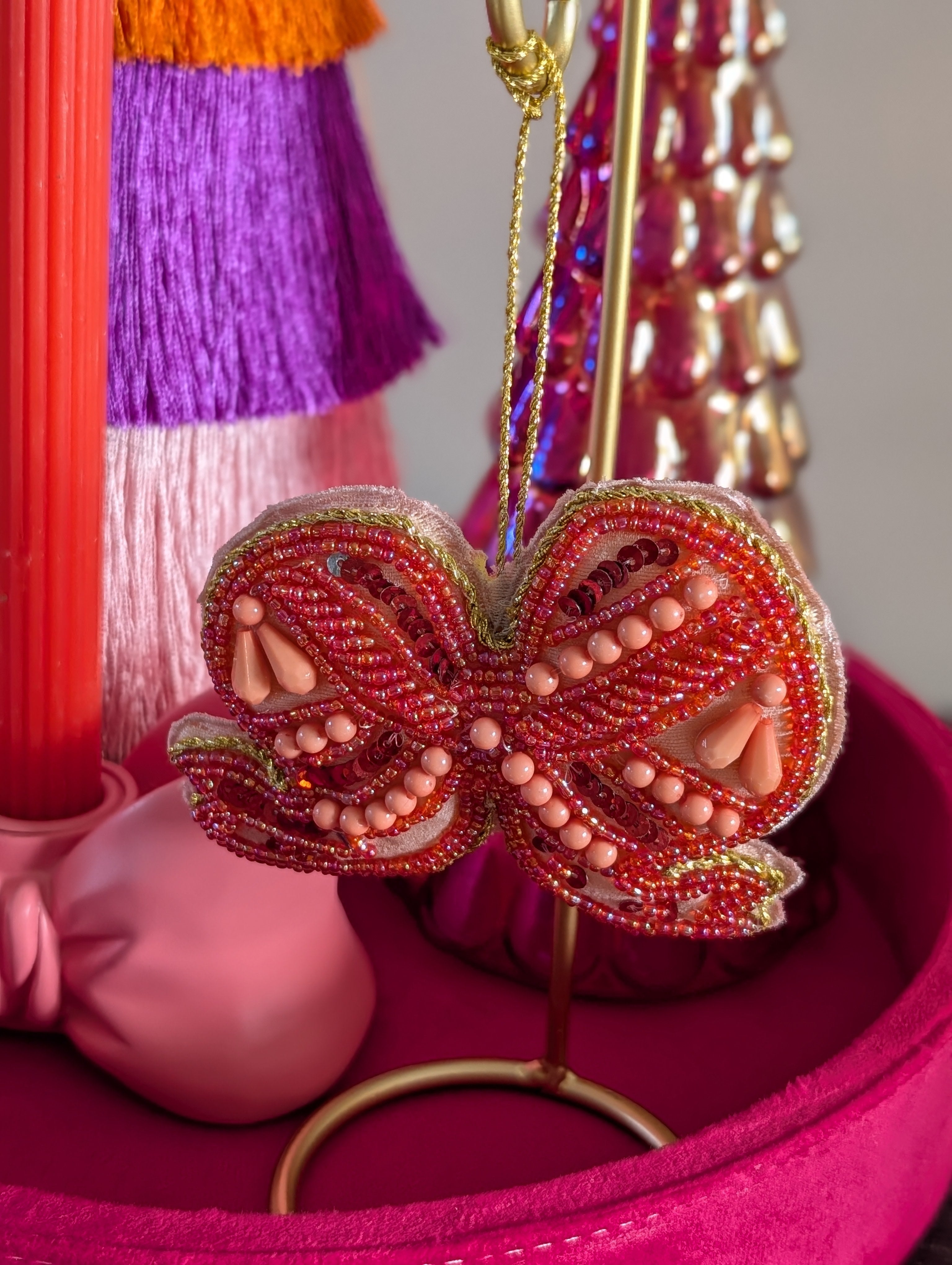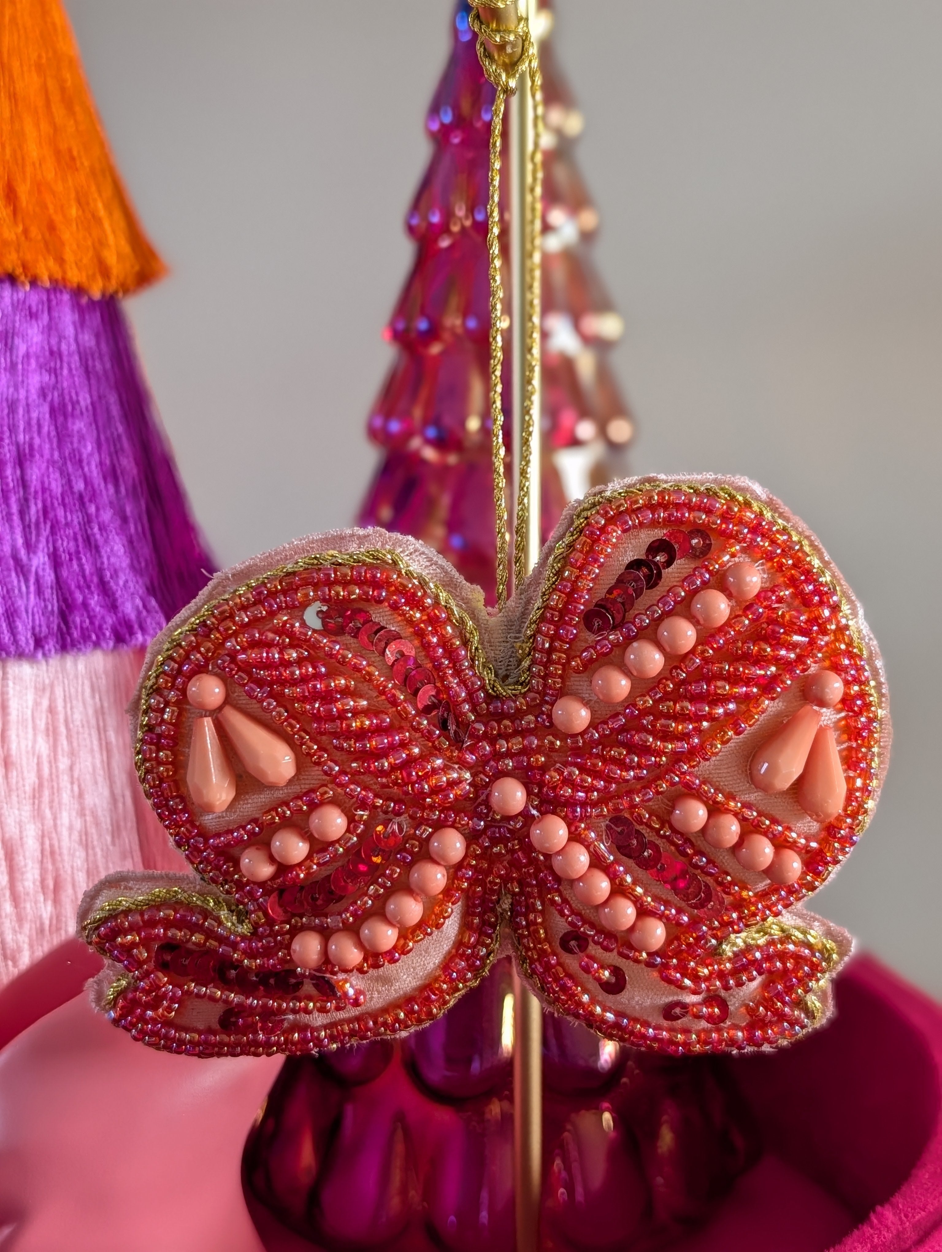 Deze prachtige handgemaakte hanger in de vorm van een strik is een ware blikvanger. Met zorgvuldig aangebrachte kraaltjes in diverse rood-, zalm en goudtinten, creëert hij een sprankelend en gedetailleerd design. De afmetingen van 9x9 cm maken hem ideaal als unieke decoratie. Perfect om je kerstboom een persoonlijke en artistieke touch te geven, of als een charmant cadeau voor liefhebbers van ambachtelijke decoraties.
