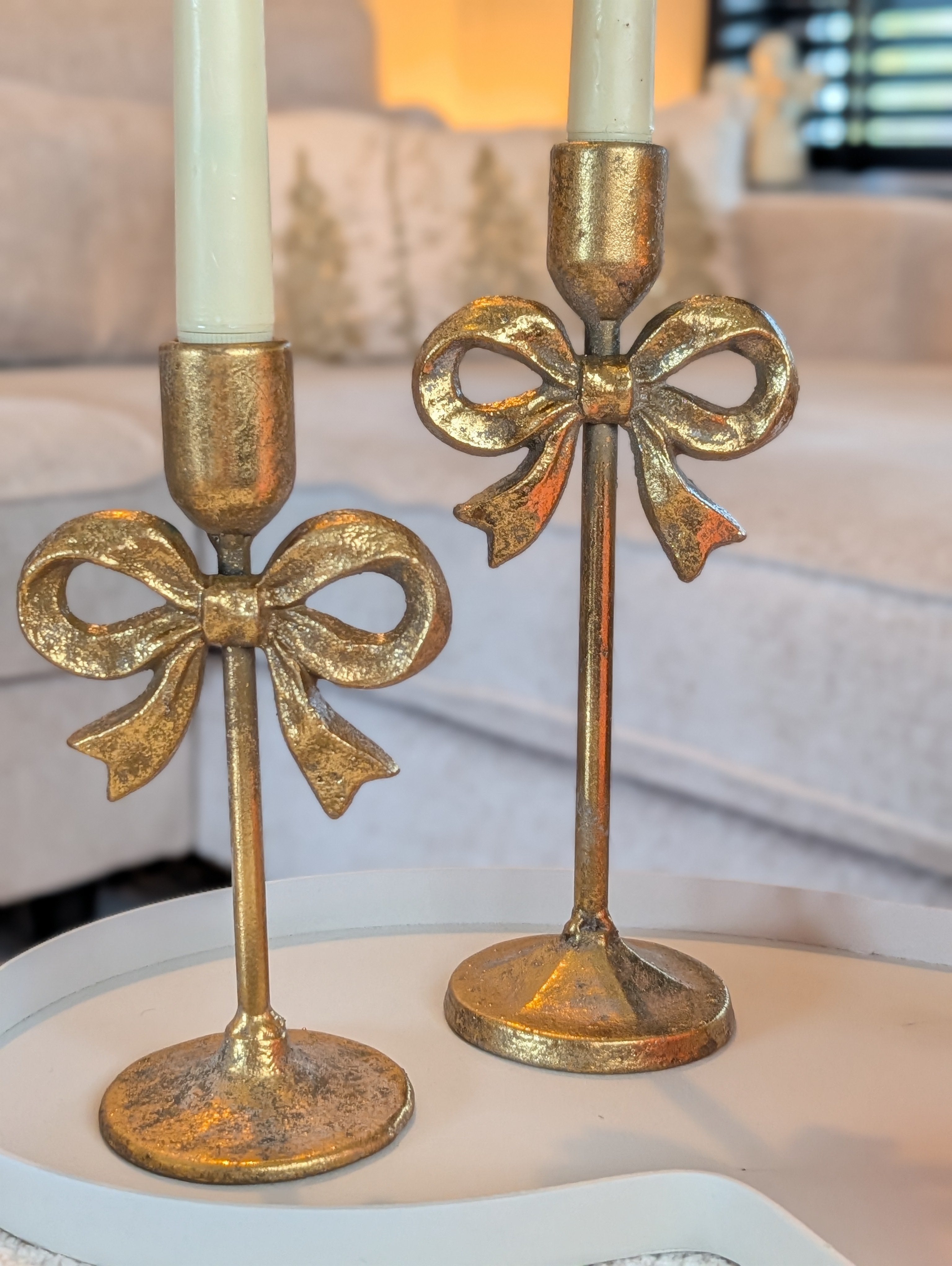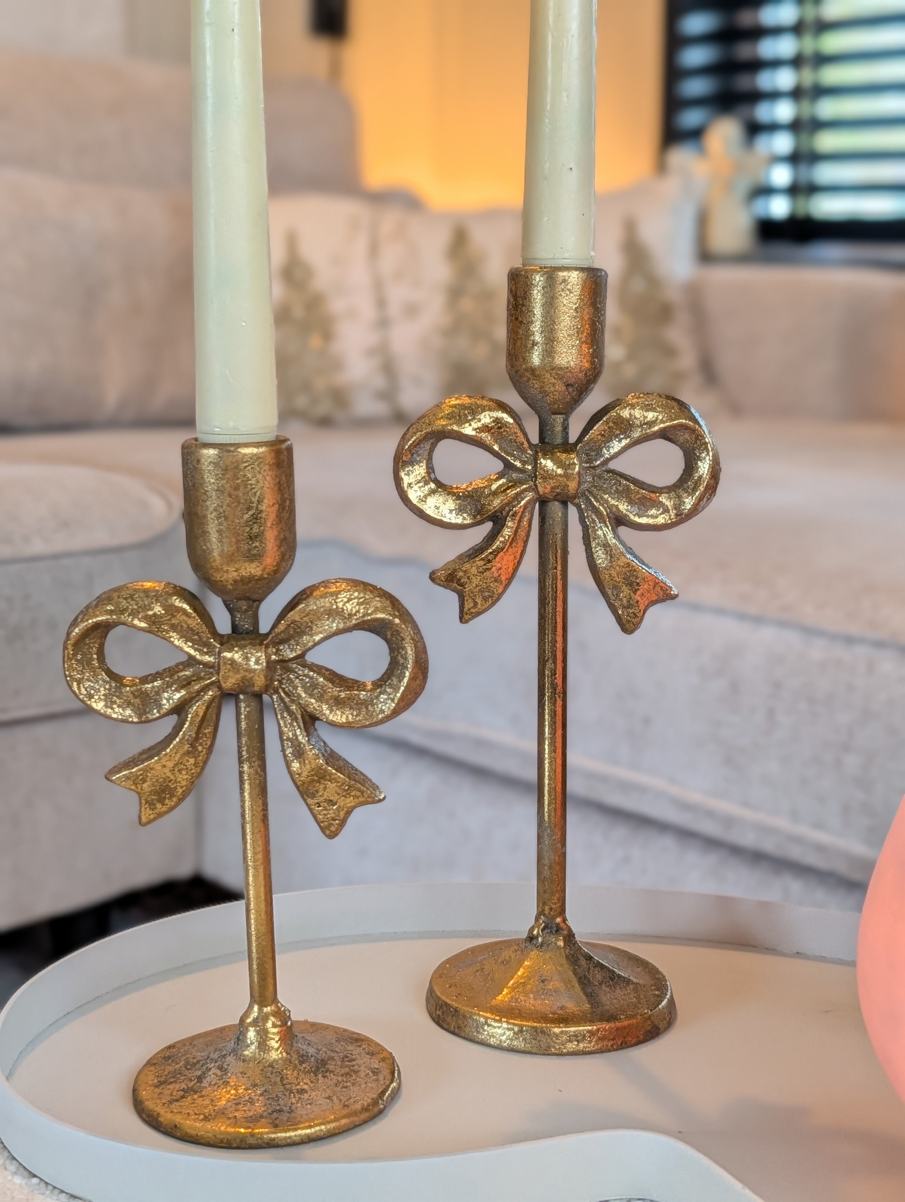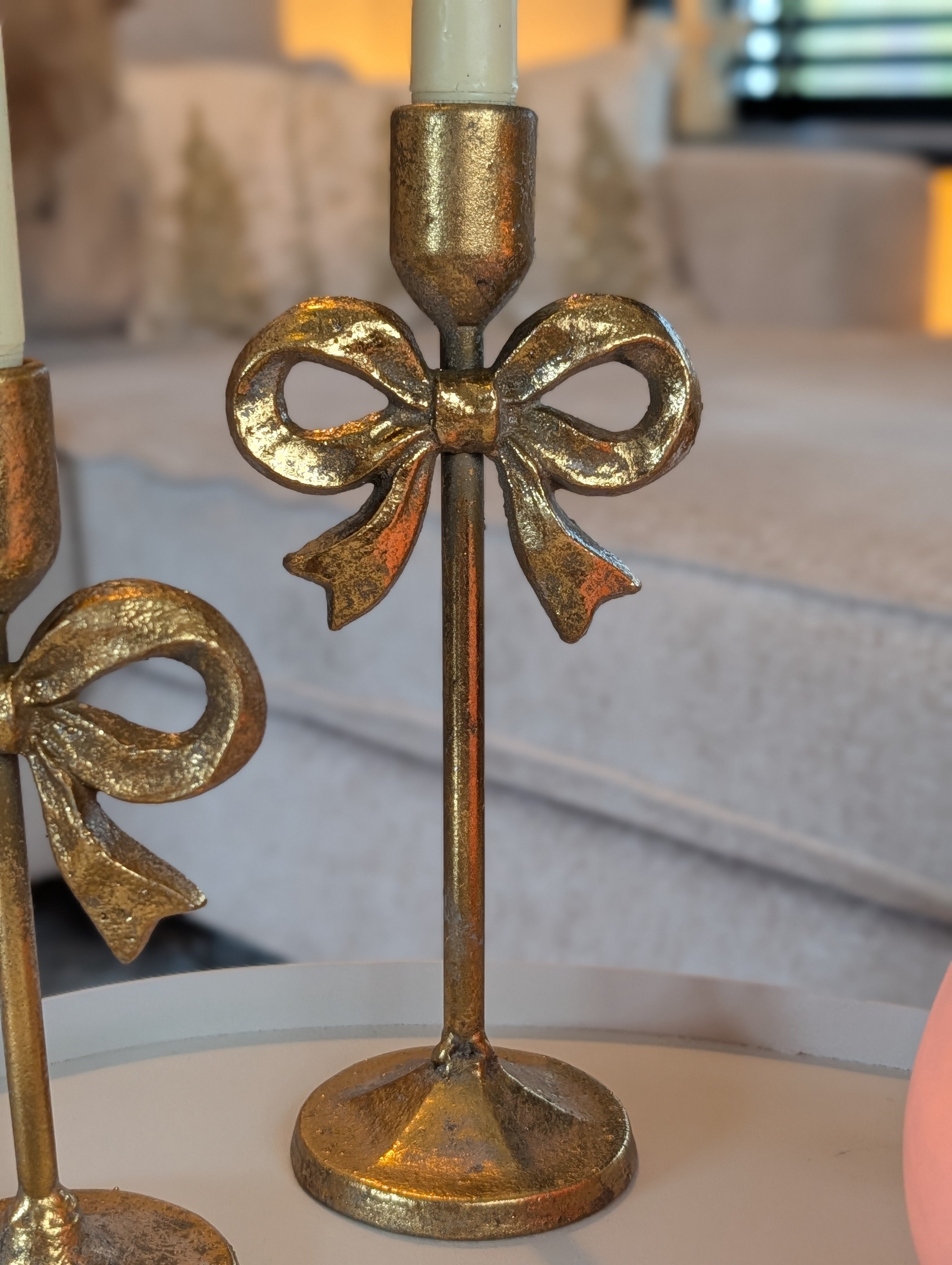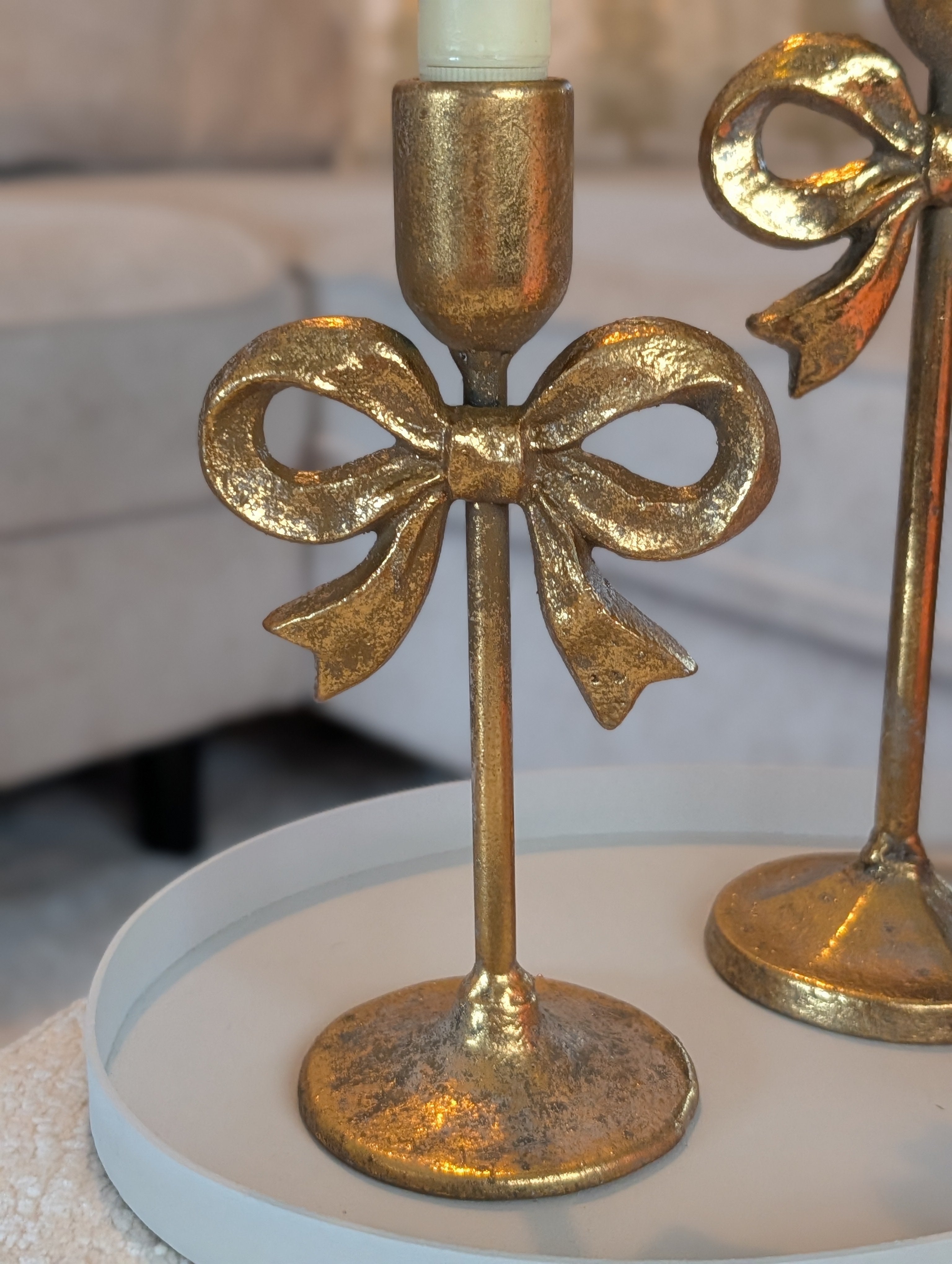 Verlicht de feestdagen met deze prachtige set van twee gouden kandelaars, versierd met charmante strikken. Deze unieke kandelaars voegen een feestelijke en elegante touch toe aan elke ruimte en zijn perfect om een warme, uitnodigende sfeer te creëren tijdens de kerstperiode.