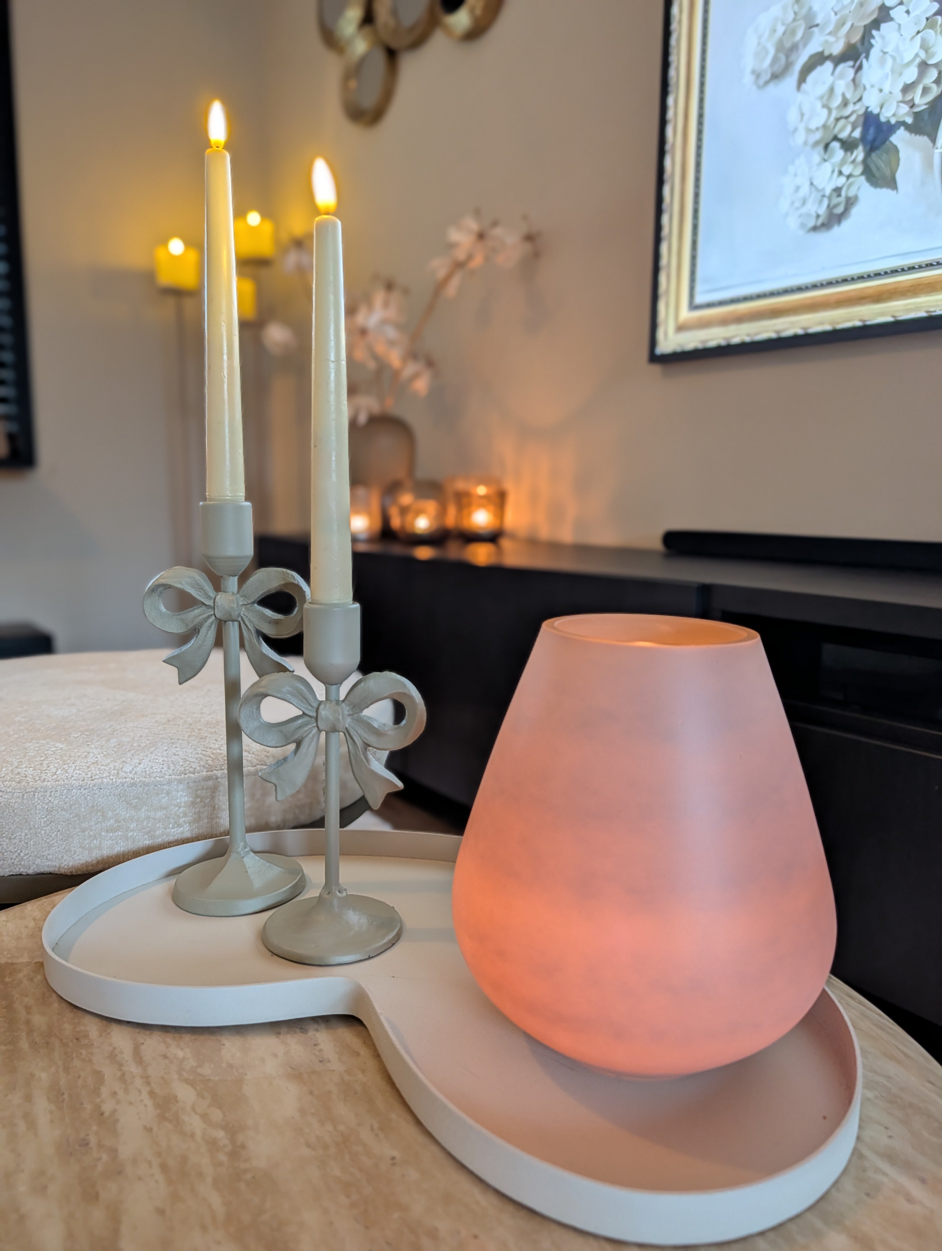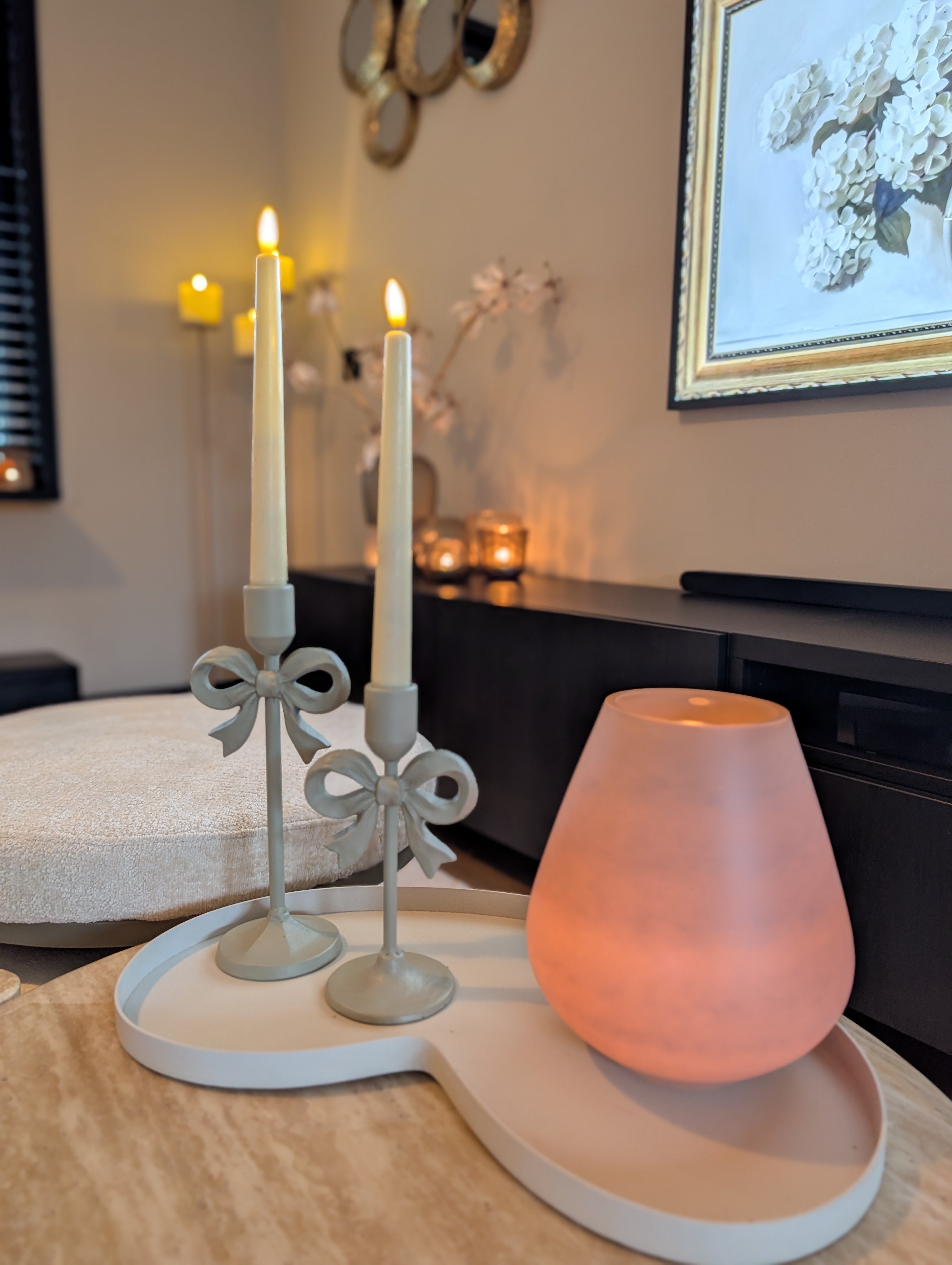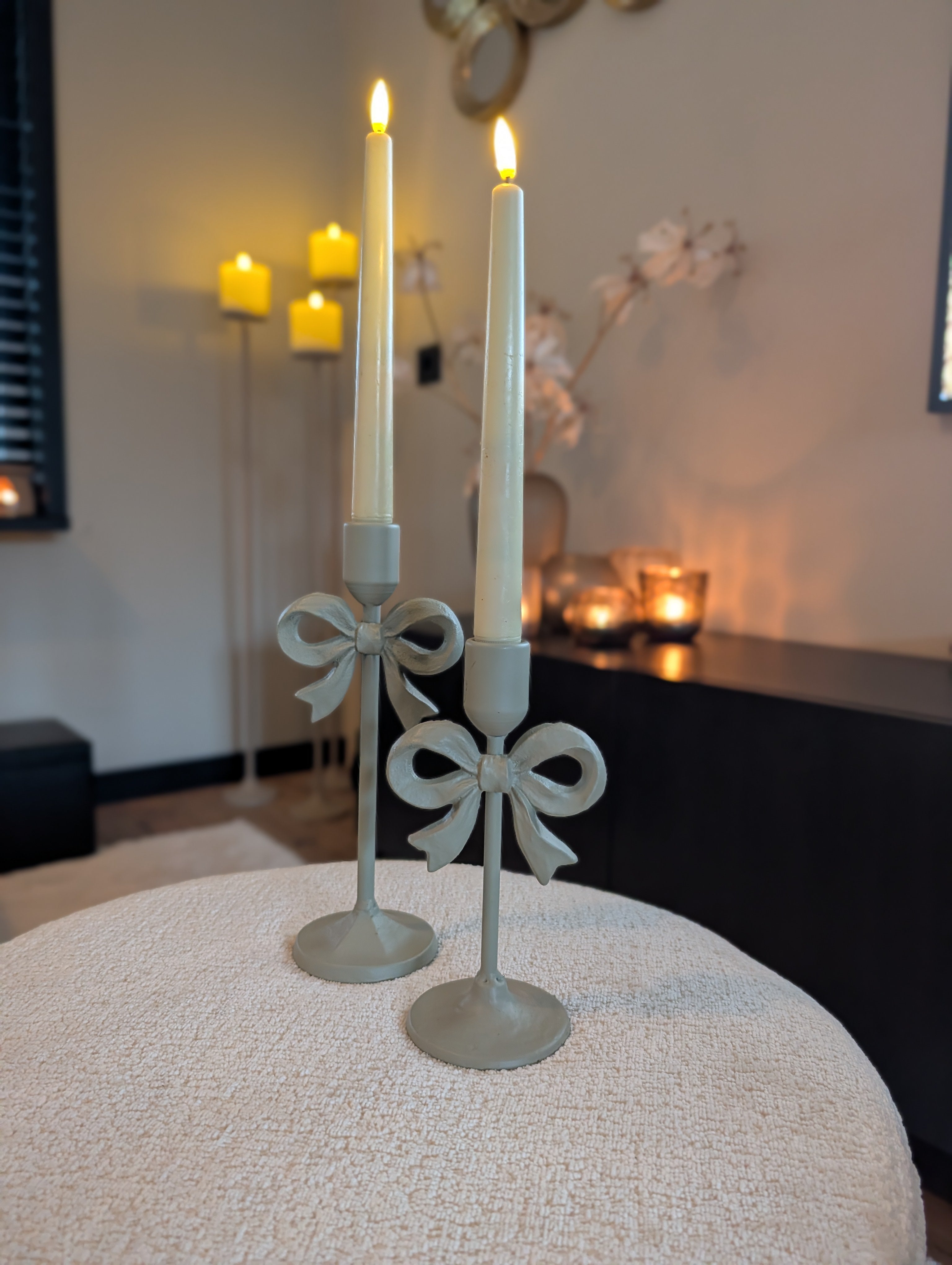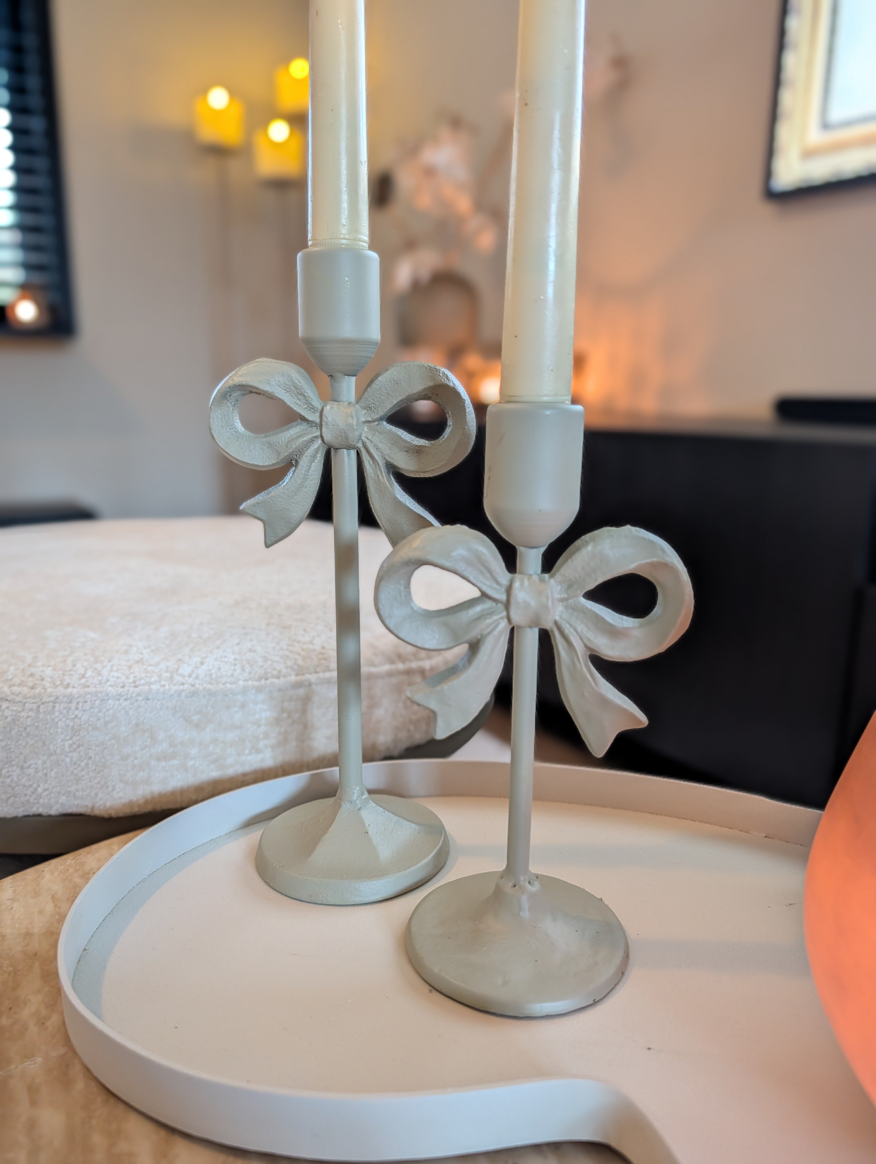 Deze charmante set van twee taupekleurige kandelaars, verrijkt met een verfijnd strikontwerp, is een prachtige aanwinst voor elk interieur. Ze bieden een subtiele elegantie die perfect past bij zowel een moderne als een klassieke inrichting.