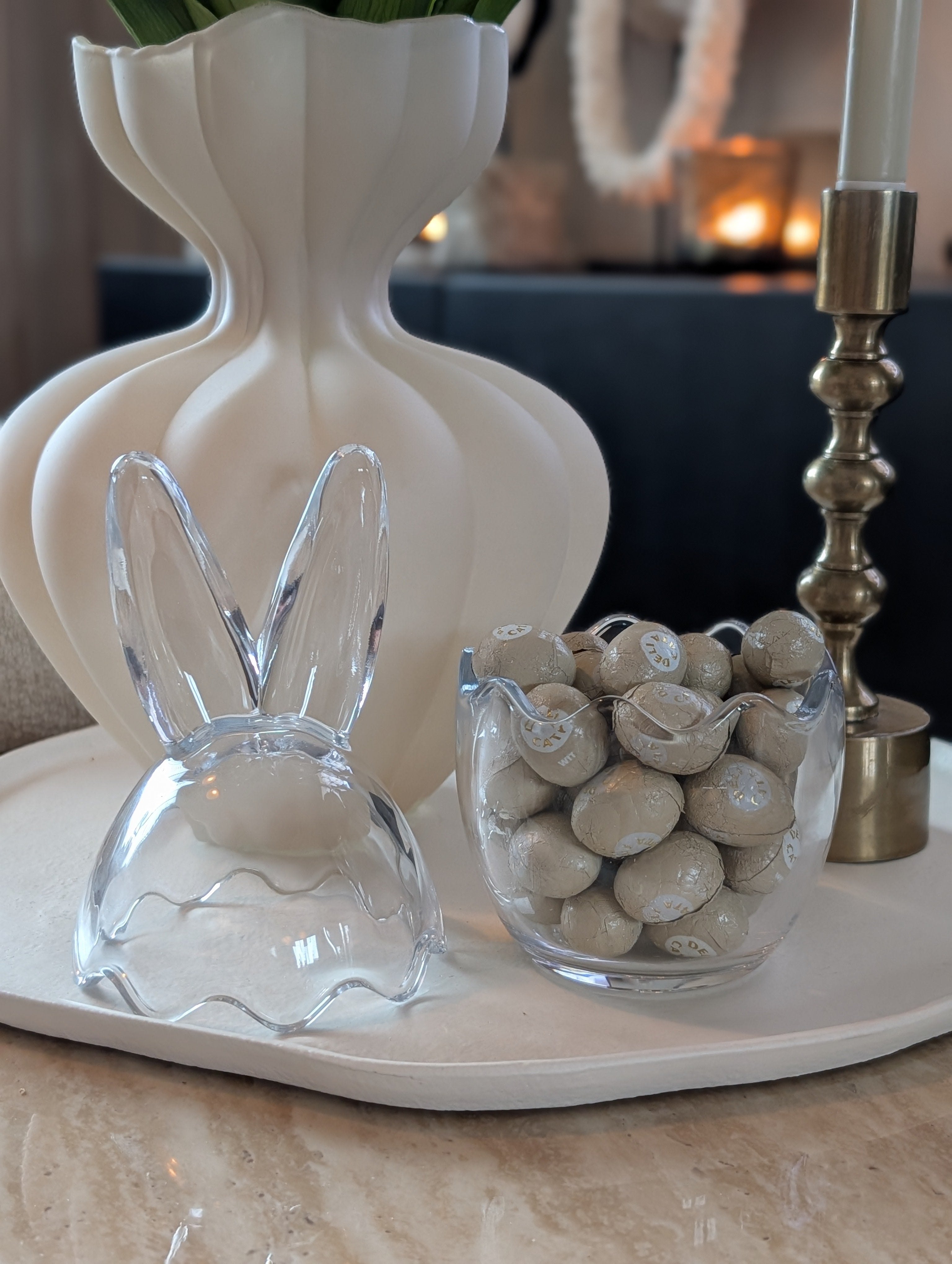 Dit prachtige glazen haaspotje straalt rust en klasse uit door zijn minimalistische, gladde afwerking. Met zijn golvende rand en kenmerkende oren is het een subtiele maar stijlvolle toevoeging aan je paasdecoratie of serveertafel.