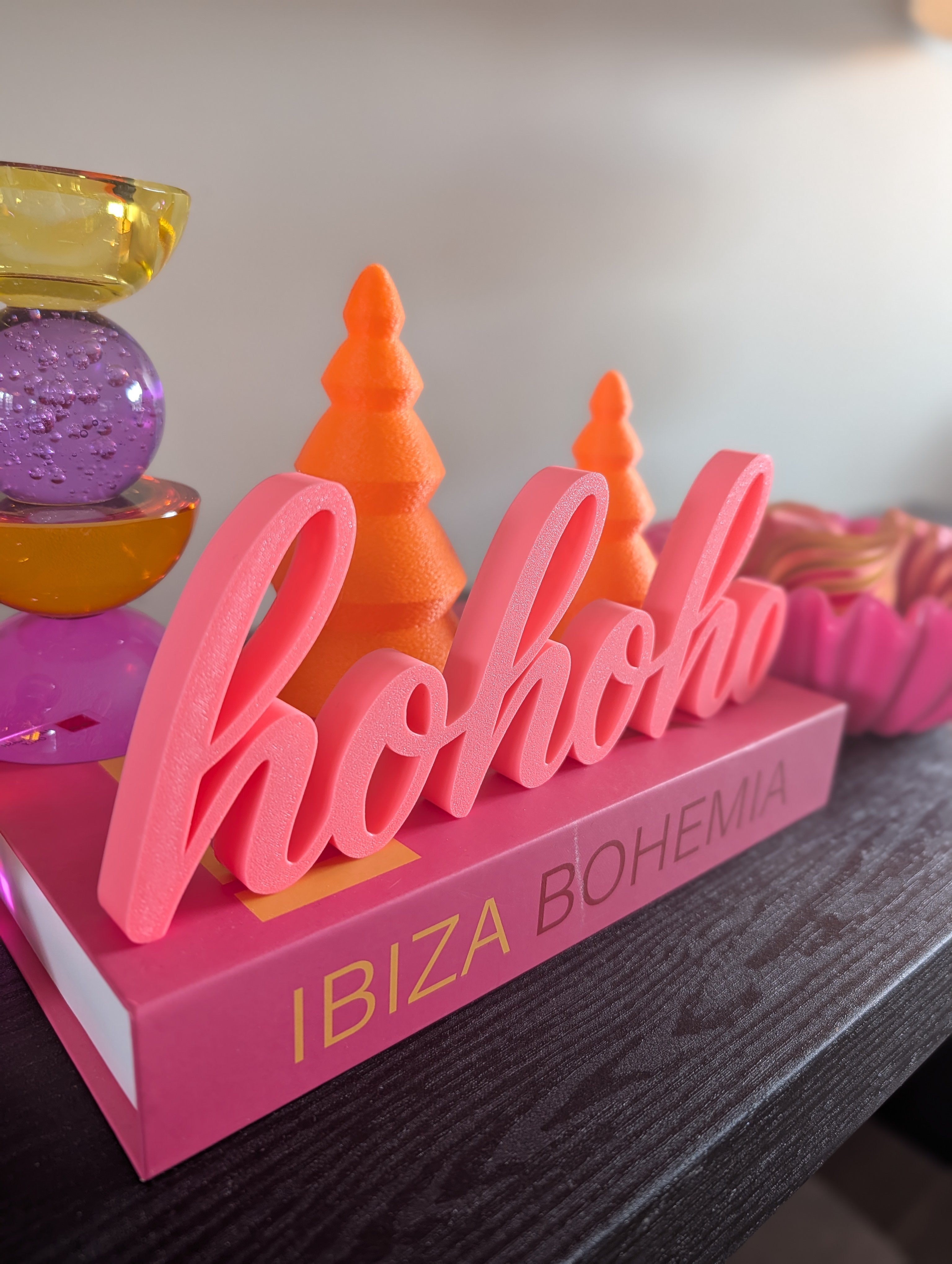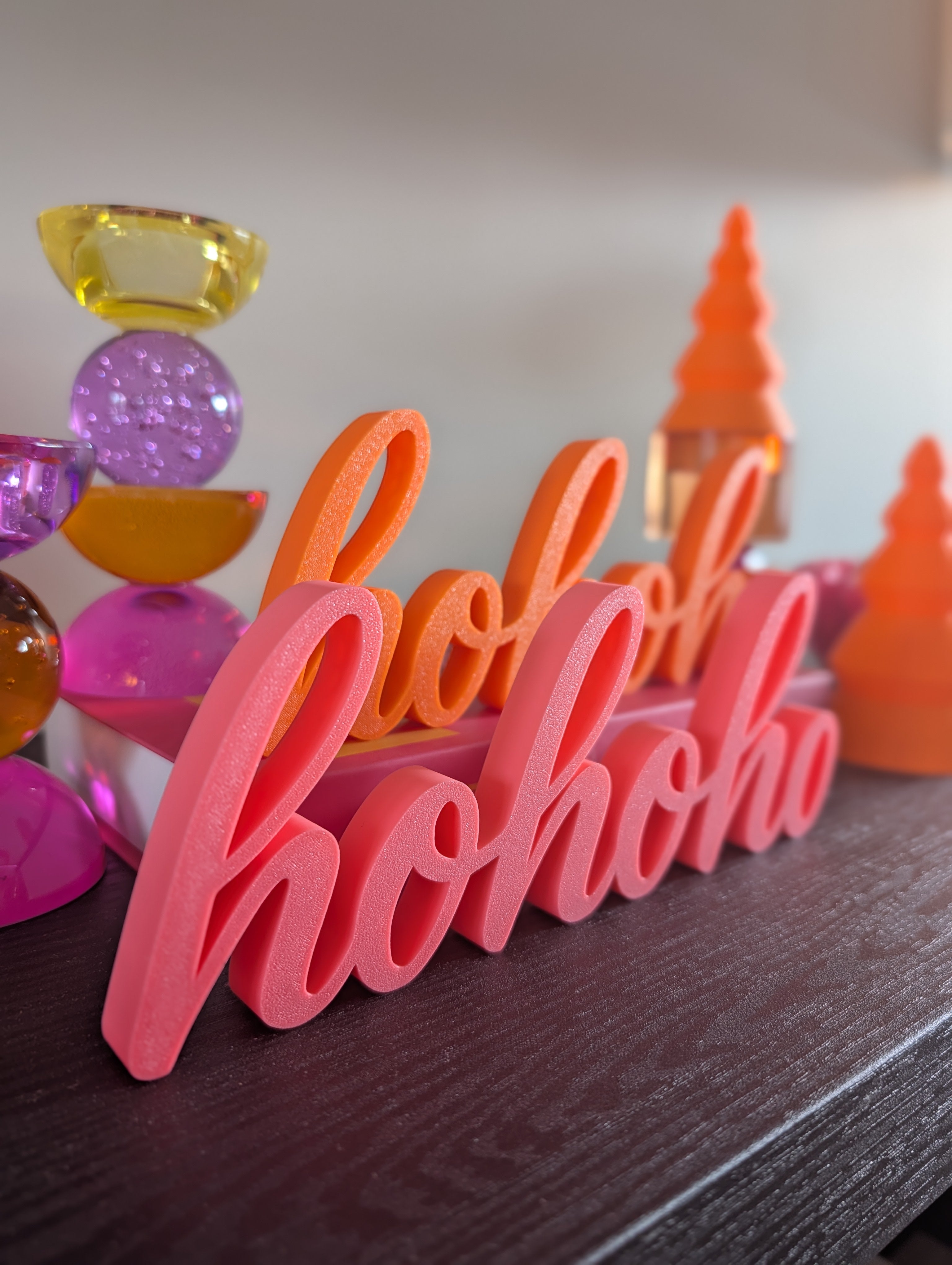 Breng de feestvreugde in huis met dit charmante en stijlvolle 3D-geprinte tekstornament met de klassieke kerstgroet "ho ho ho". Dit decoratieve stuk is de perfecte aanvulling op je feestelijke inrichting en voegt een moderne, doch warme, touch toe.