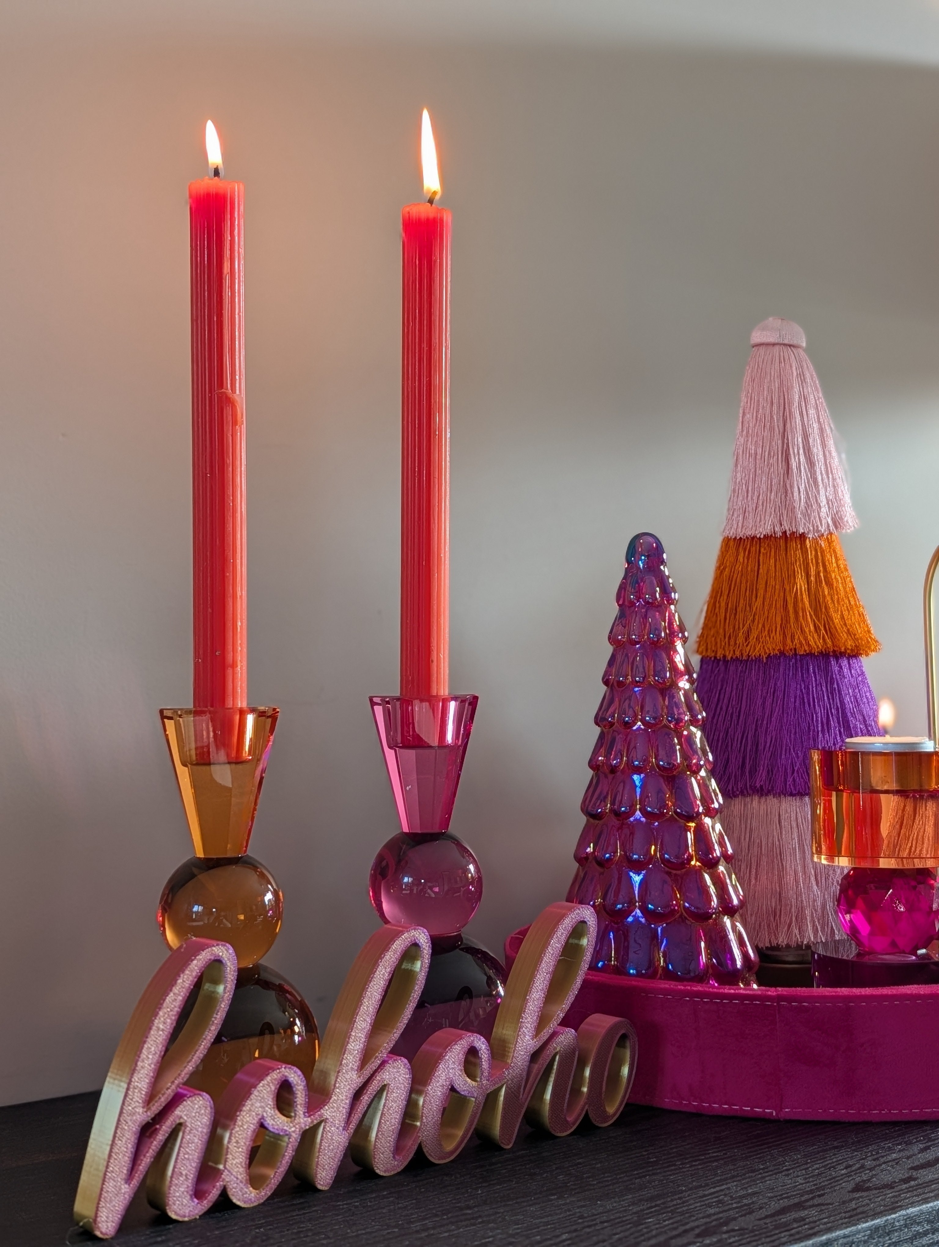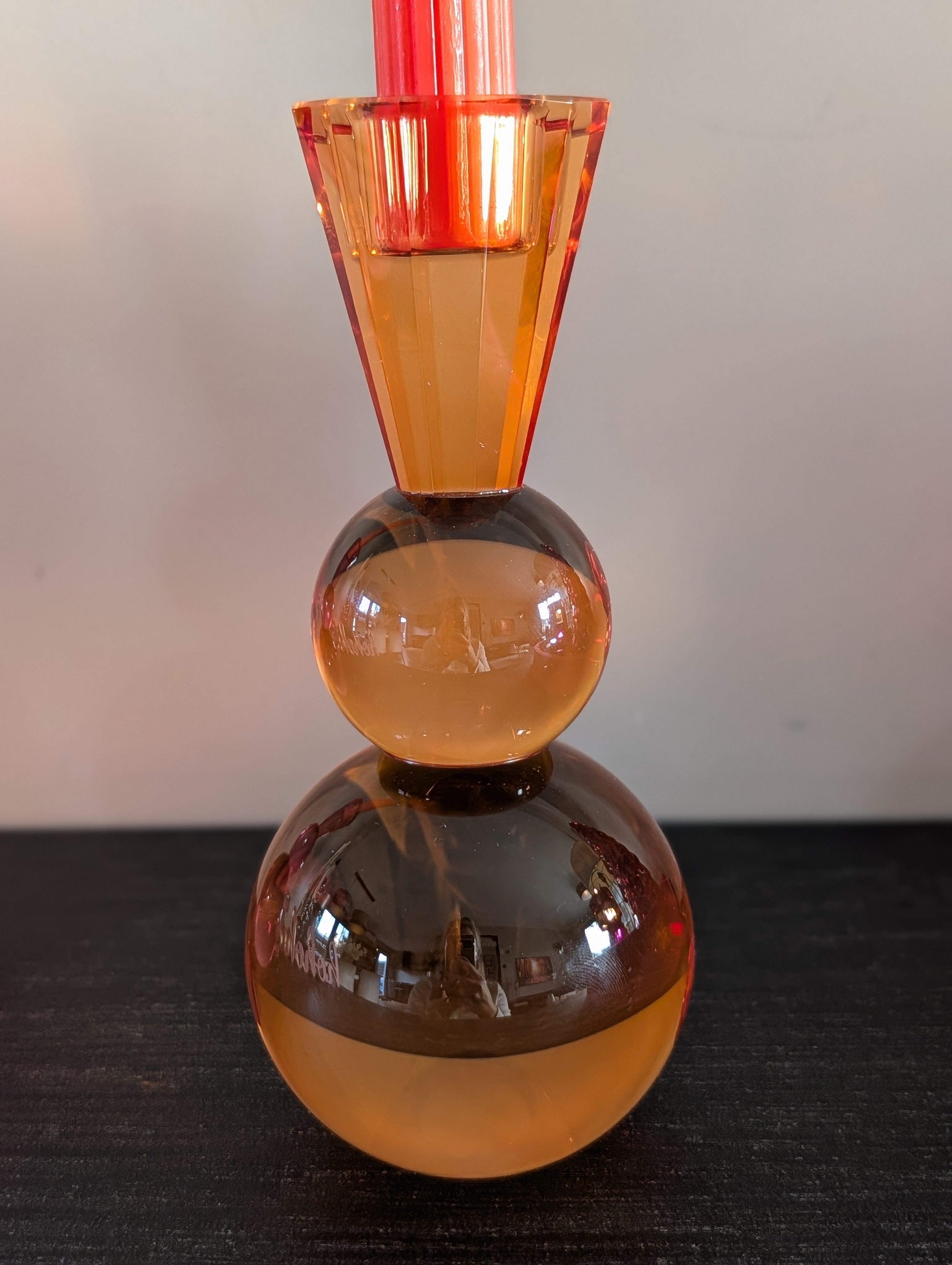 Deze eigentijdse kandelaren voegen een vleugje kleur en speelsheid toe aan elk interieur. Elk stuk, met een hoogte van 17,5 cm, is prachtig gevormd met gestapelde geometrische en ronde elementen van gekleurd glas. De ene kandelaar straalt in warme oranjetinten, terwijl de andere een diepe roze gloed heeft. Ze zijn apart verkrijgbaar, waardoor je ze perfect kunt mixen en matchen om een unieke en persoonlijke sfeer te creëren. Ideaal voor slanke dinerkaarsen en een stijlvolle blikvanger op een dressoir, eettafel of vensterbank.