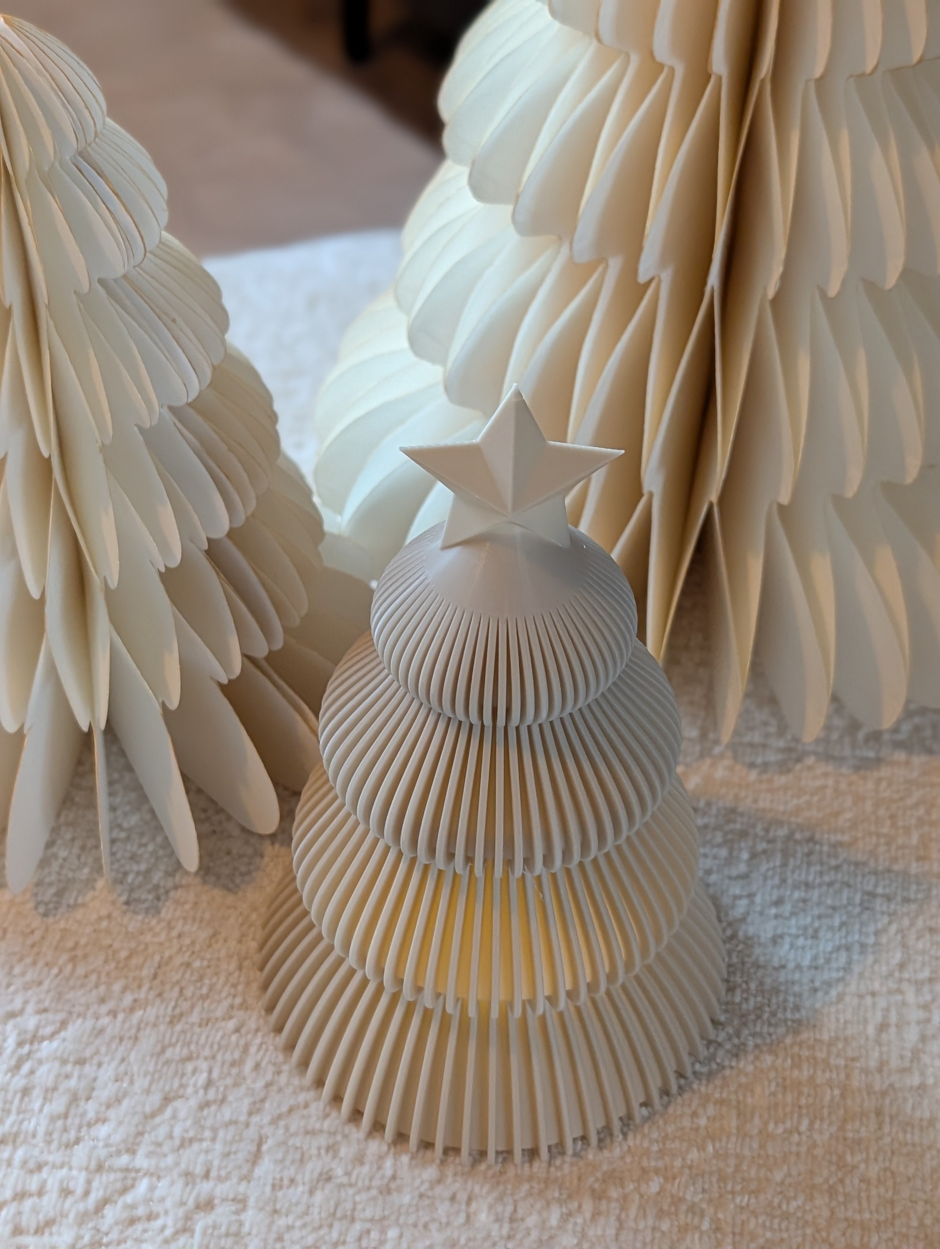 Voeg een vleugje moderne, minimalistische charme toe aan uw kerstdecor met dit prachtig 3D-geprinte kerstboompje. Het unieke ontwerp kenmerkt zich door een elegante gelaagde structuur met fijne ribbels, wat zorgt voor een zachte en sfeervolle uitstraling wanneer het wordt verlicht. Een sierlijke ster siert de top van het boompje.