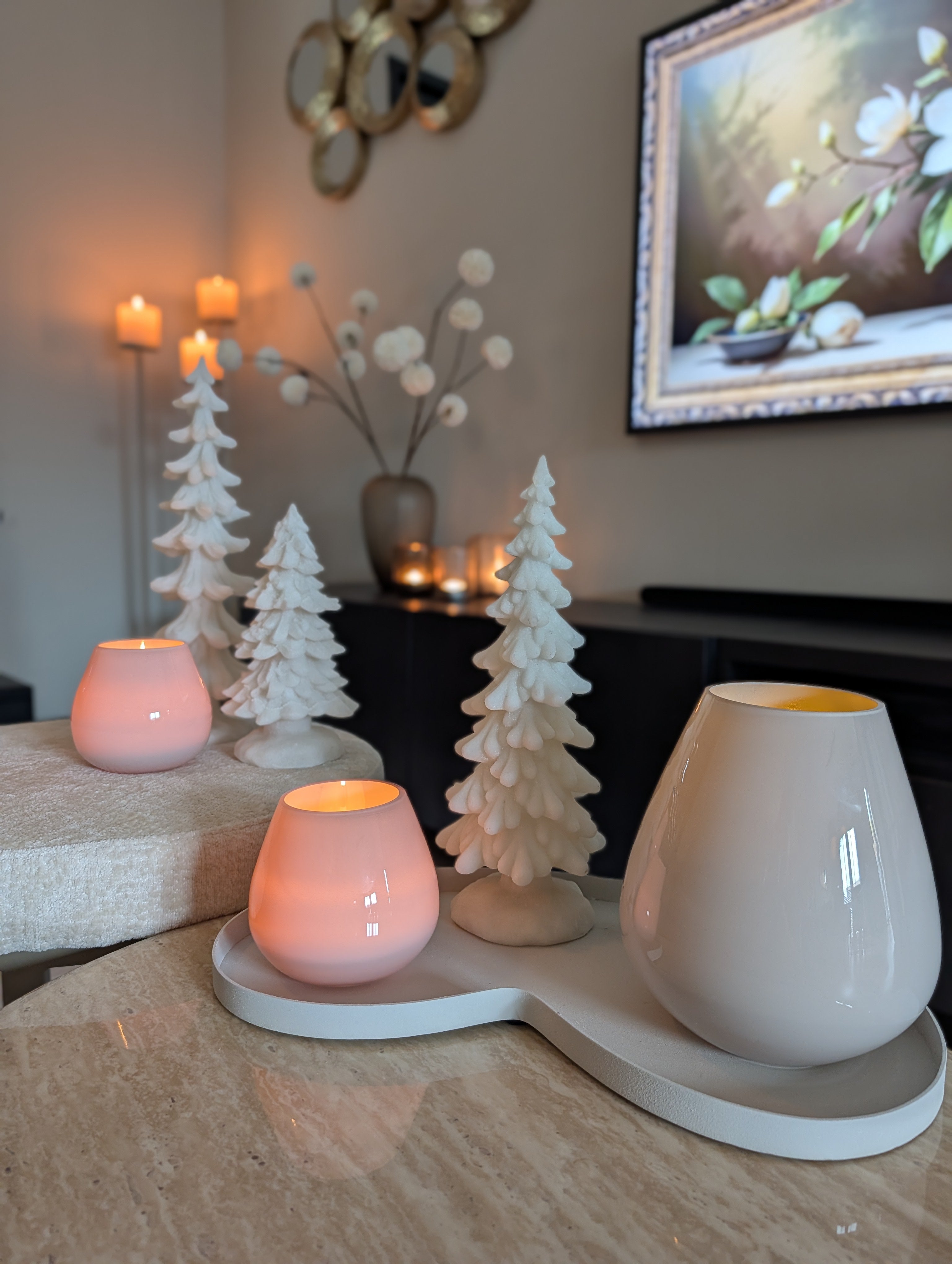 De boompjes zijn gedetailleerd afgewerkt met speelse laagjes die doen denken aan besneeuwde dennentakken. Dankzij hun tijdloze design passen ze perfect bij zowel moderne als klassieke kerstdecoraties. Zet ze op een dressoir, vensterbank of als middelpunt van je feesttafel en creëer een warme, feestelijke sfeer.