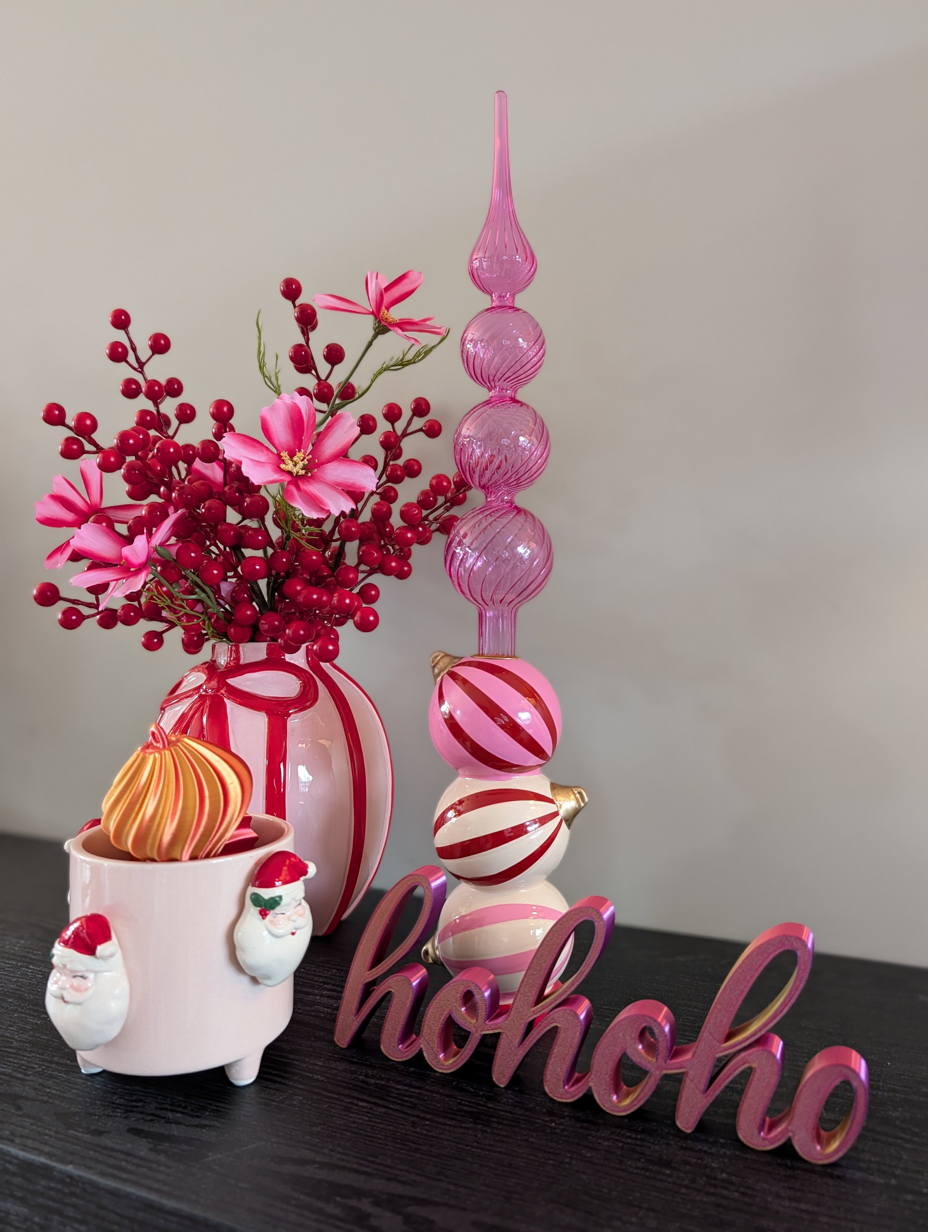 Breng de magie van Kerstmis in huis met deze charmante, lichtroze bloempot! Het potje heeft een glanzende afwerking en staat op drie subtiele voetjes. Het absolute hoogtepunt is het prachtige, driedimensionale reliëf van een lachende Kerstman met zijn rode muts en witte baard, wat een vrolijke, nostalgische uitstraling geeft.