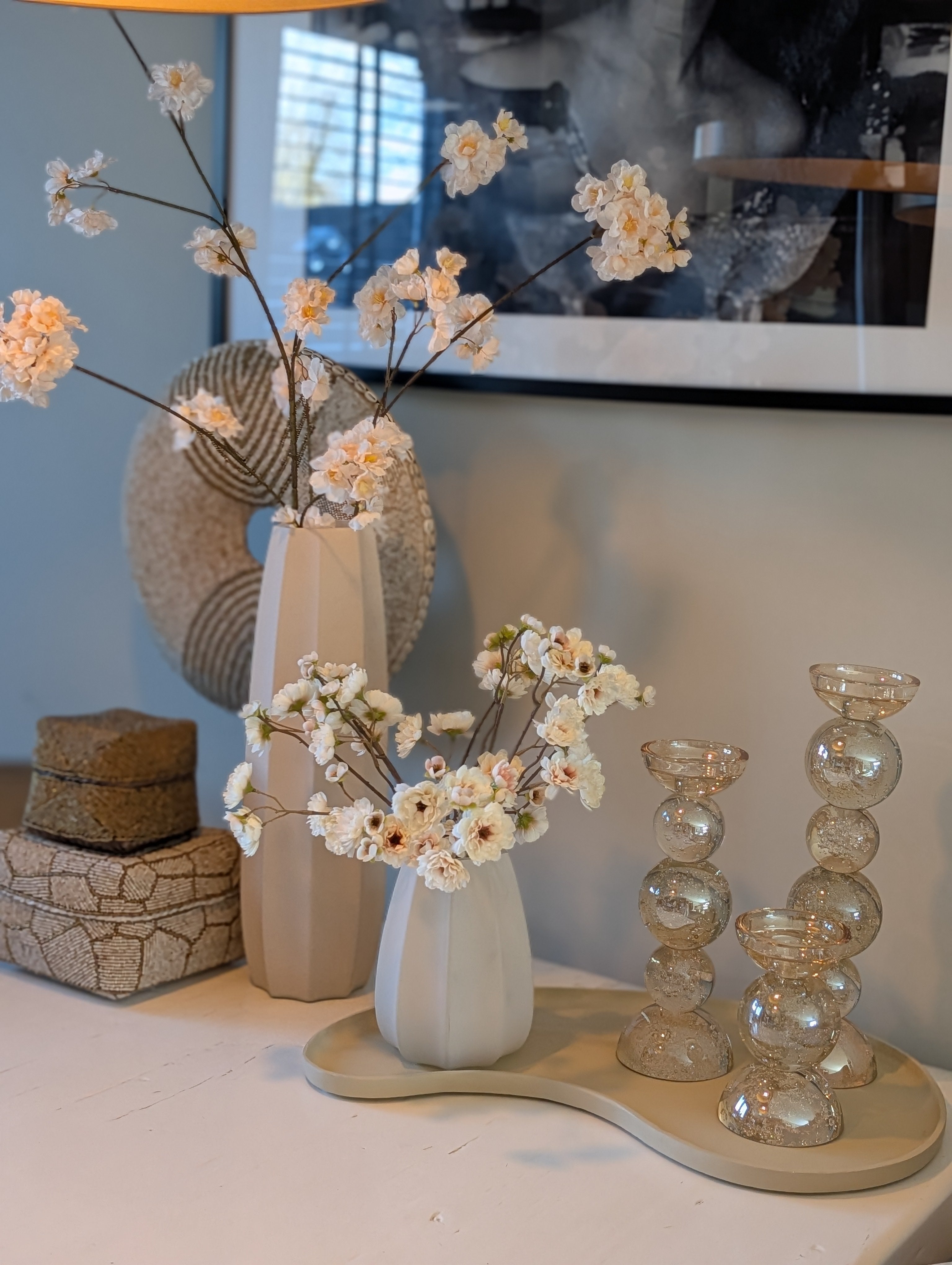 Tip voor styling: Groepeer accessoires in verschillende hoogtes op het plateau voor een speels en dynamisch effect op je eettafel, dressoir of salontafel.