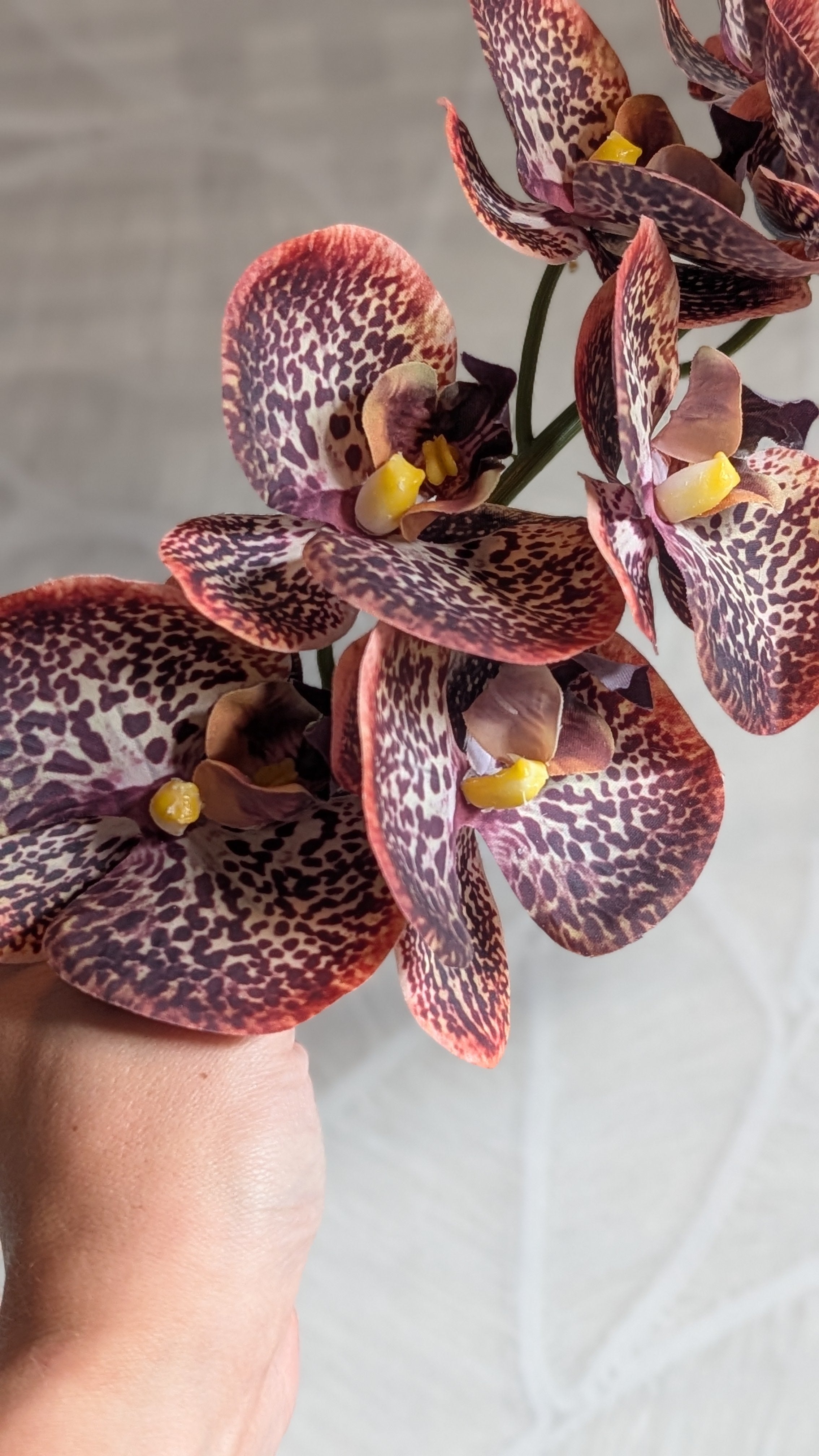 Breng een vleugje natuurlijke elegantie in huis met deze adembenemende kunst orchidee. Met een opvallende steel vol rijkgekleurde bloemen, is deze orchidee een perfecte toevoeging aan elk interieur. De bloemblaadjes zijn gedetailleerd afgewerkt met een dieprode basis, gespikkeld met donkerdere vlekken die een uniek en levendig patroon creëren. Een heldergeel accent in het hart van elke bloem zorgt voor een prachtig contrast.