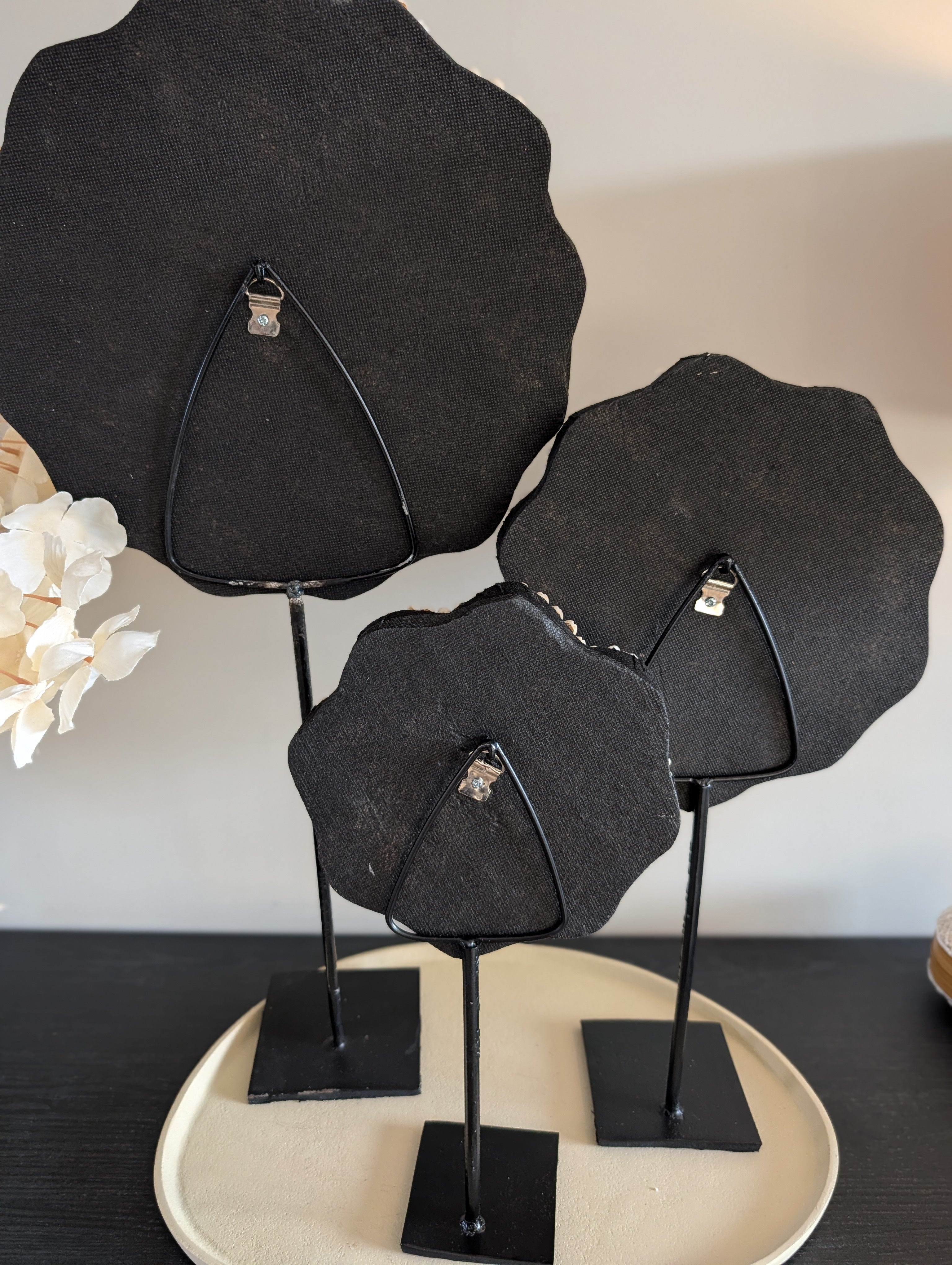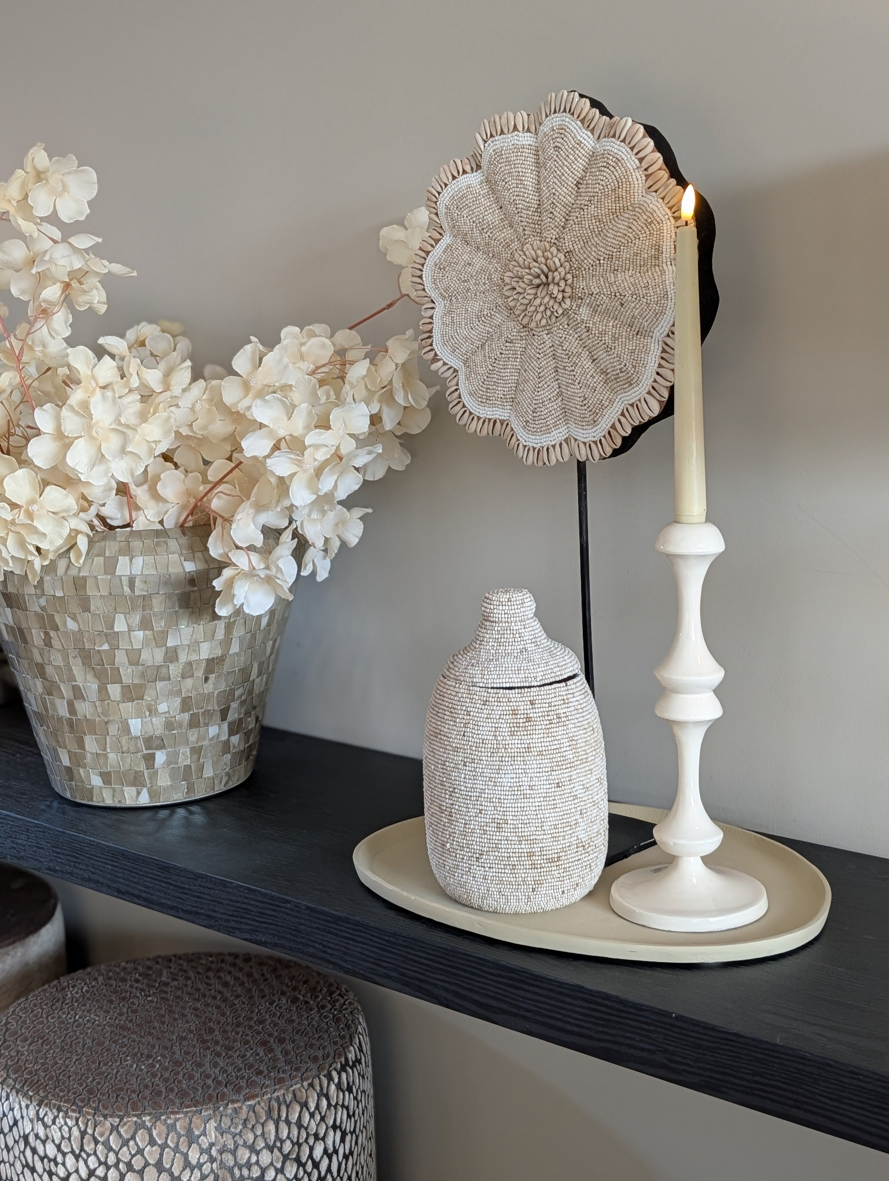 Maak een prachtig statement in je interieur met dit indrukwekkende XL ornament van Bali. Dit kunstwerk is volledig met de hand vervaardigd uit een verfijnde mix van authentieke schelpen en honderden witte kraaltjes, zorgvuldig gerangschikt in een elegant bloemmotief.