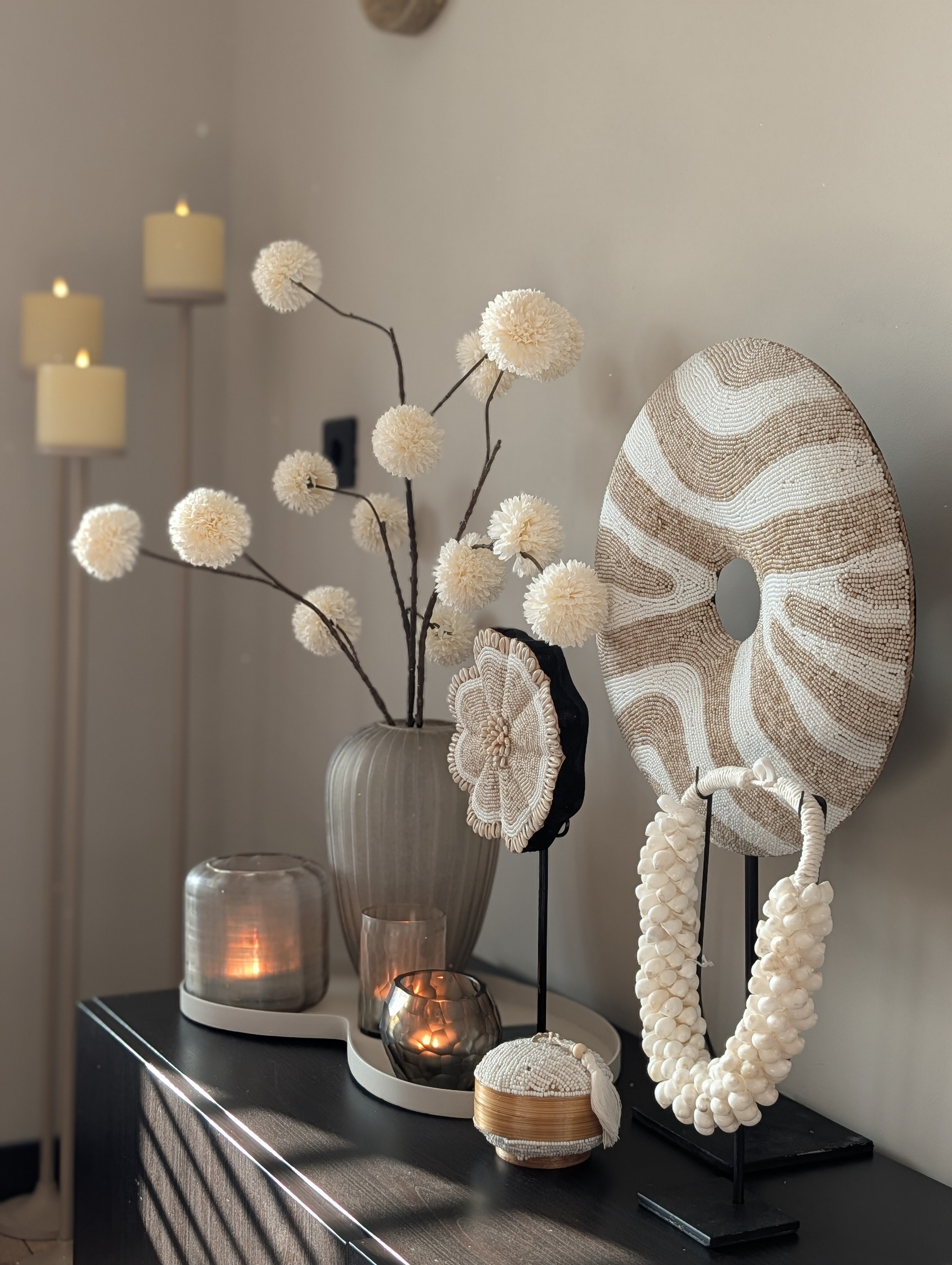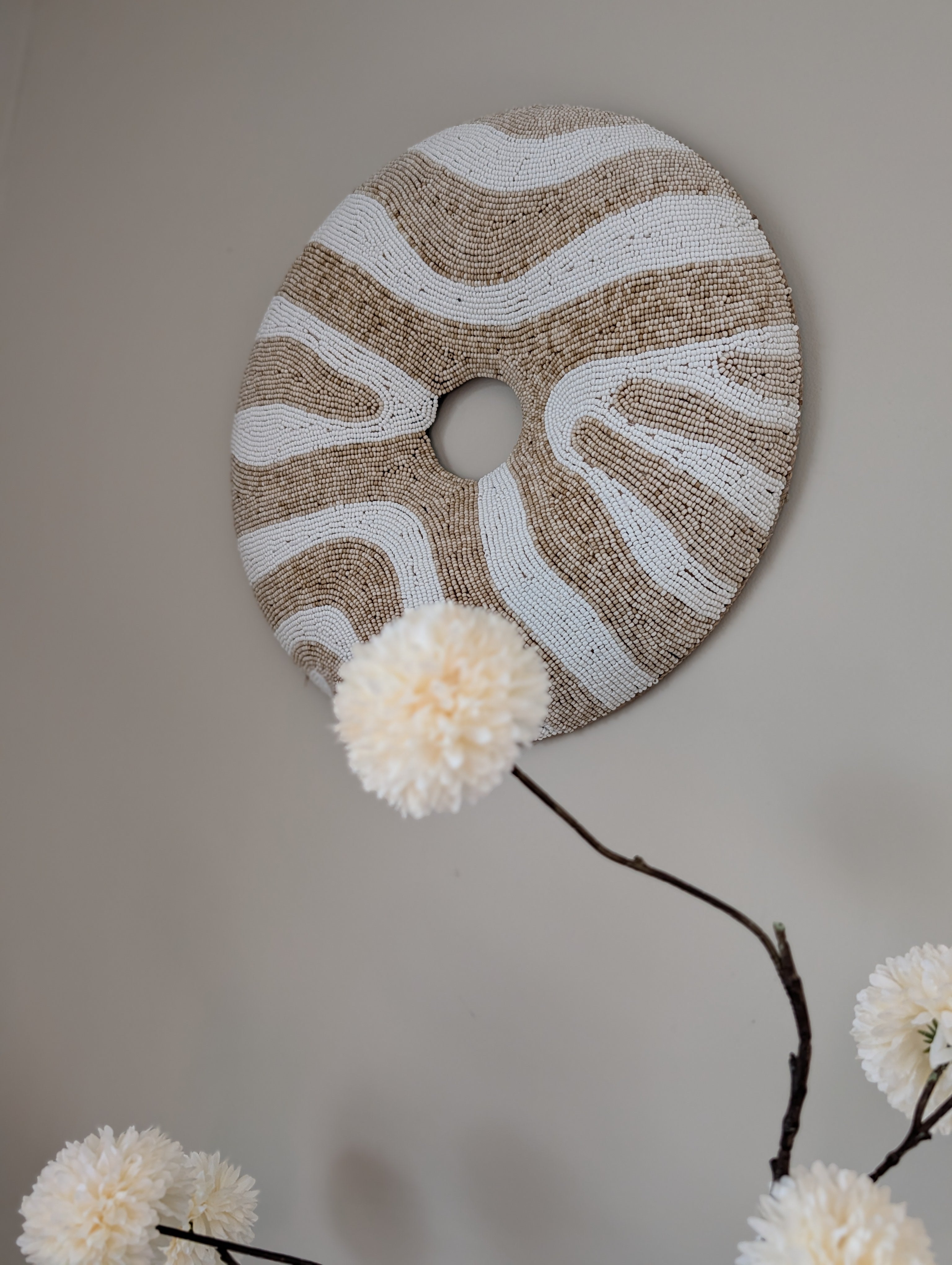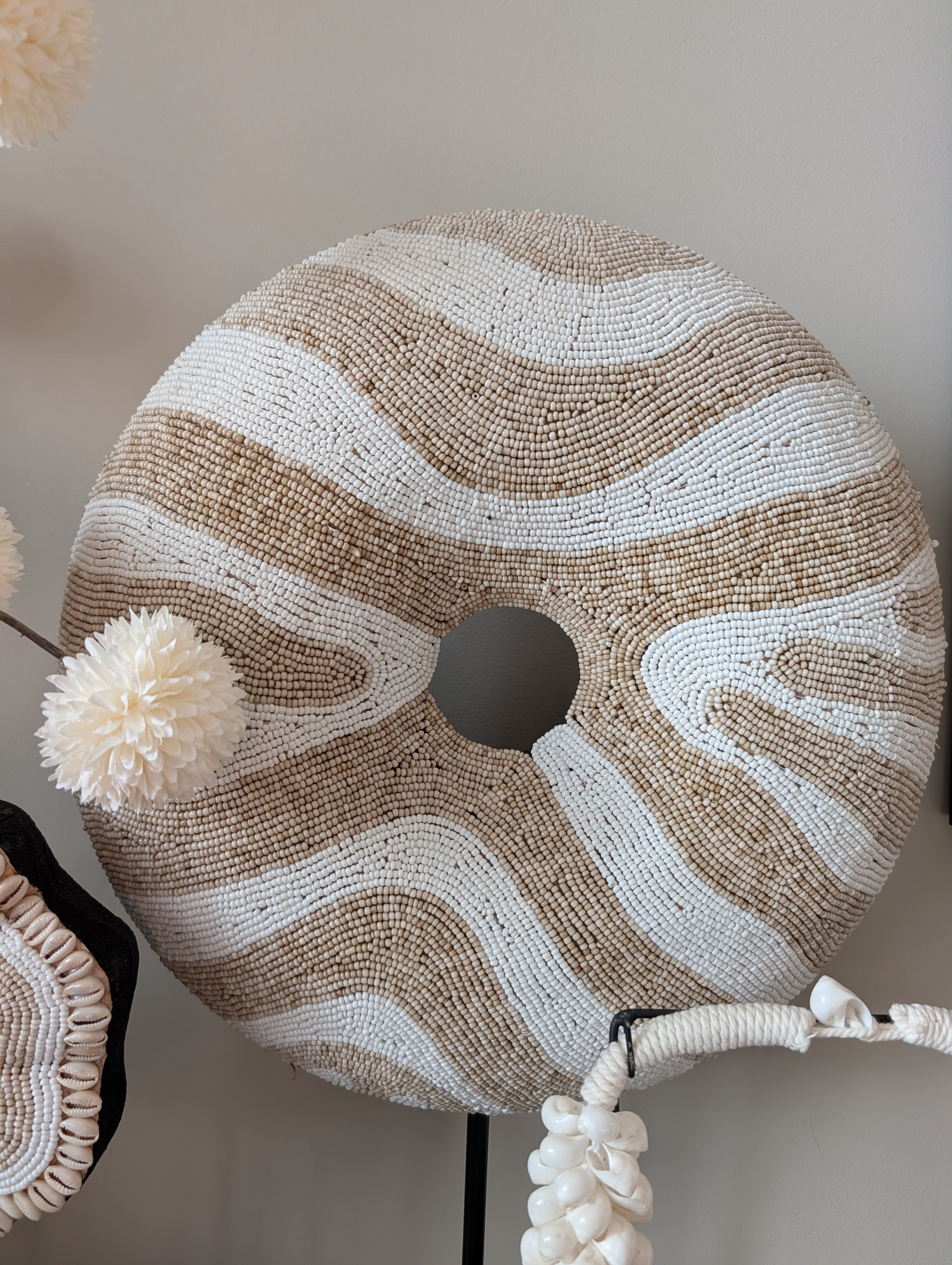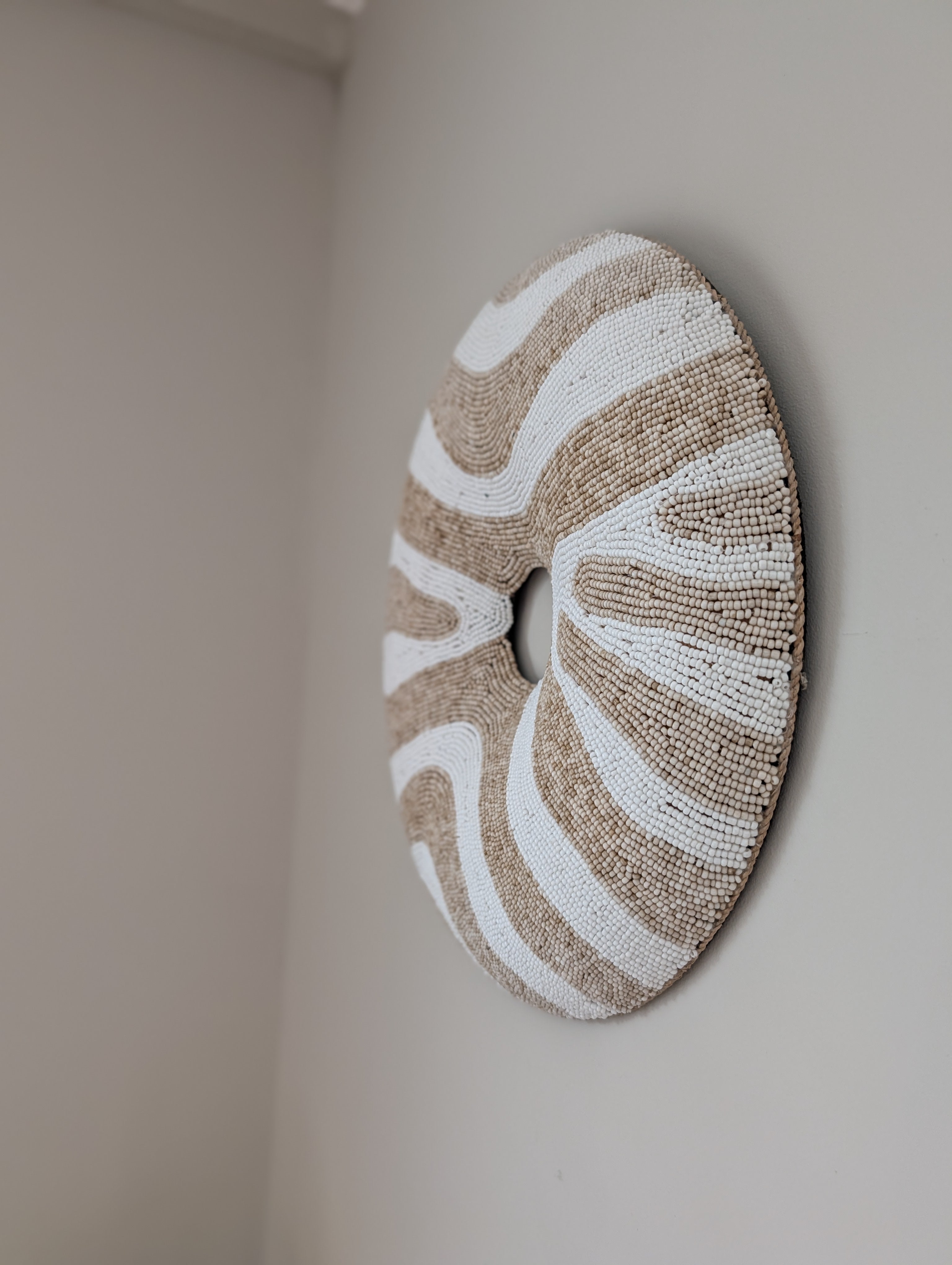Haal de authentieke sfeer van Bali in huis met dit exclusieve Donut Ornament. Dit kunstwerk is met de hand vervaardigd door lokale ambachtslieden, waardoor elk item uniek is. Het verfijnde patroon van duizenden kleine kraaltjes vormt een prachtig organisch lijnenspel in natuurlijke tinten, wat zorgt voor een rustgevende doch luxe uitstraling.