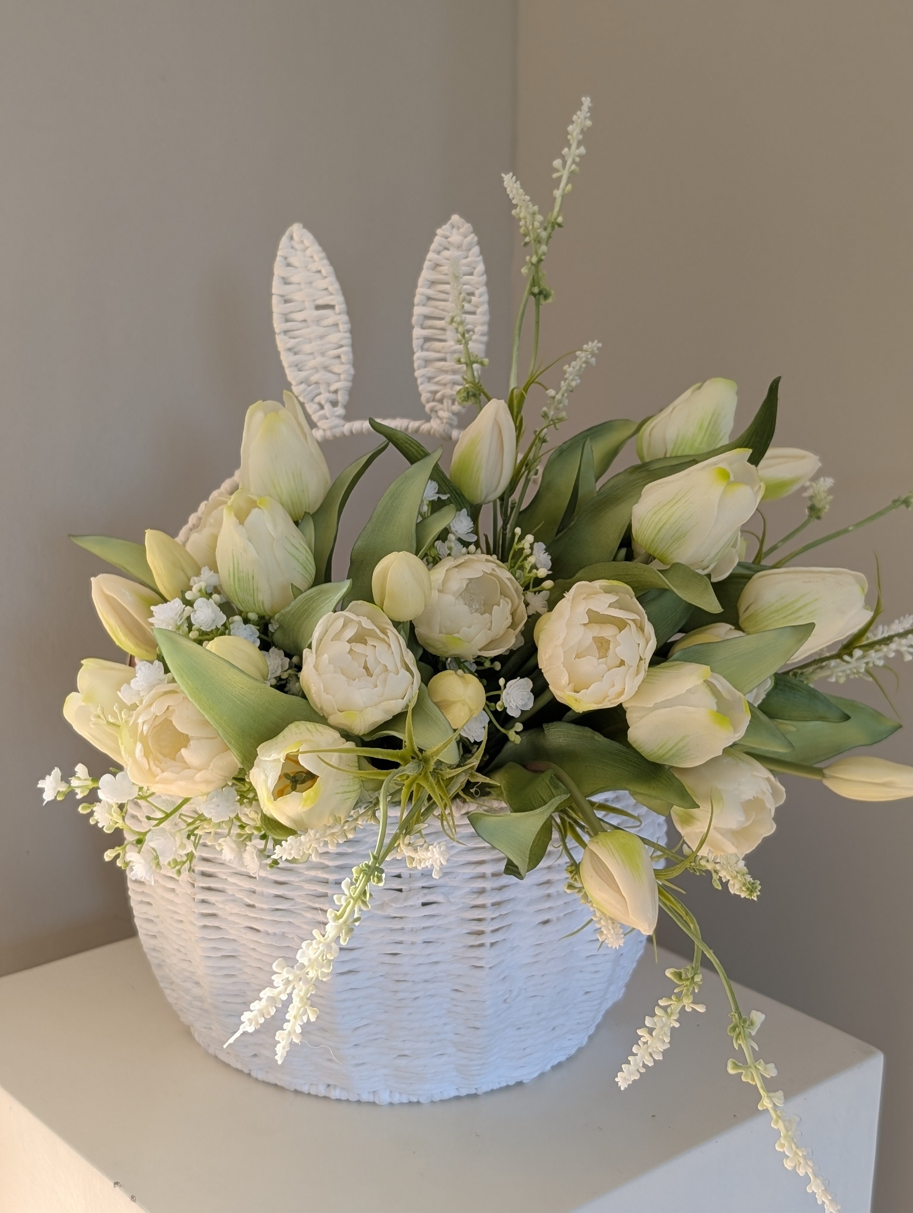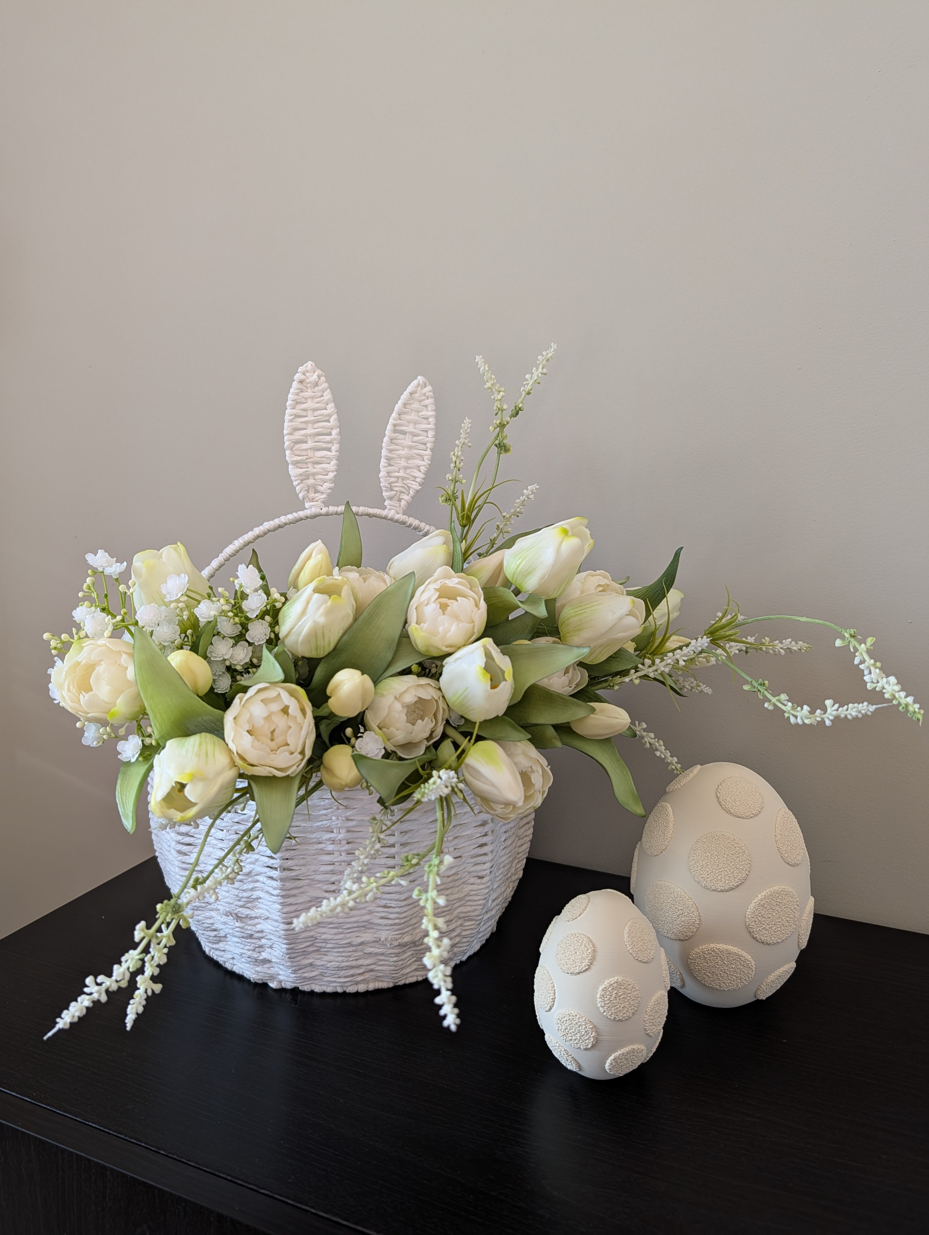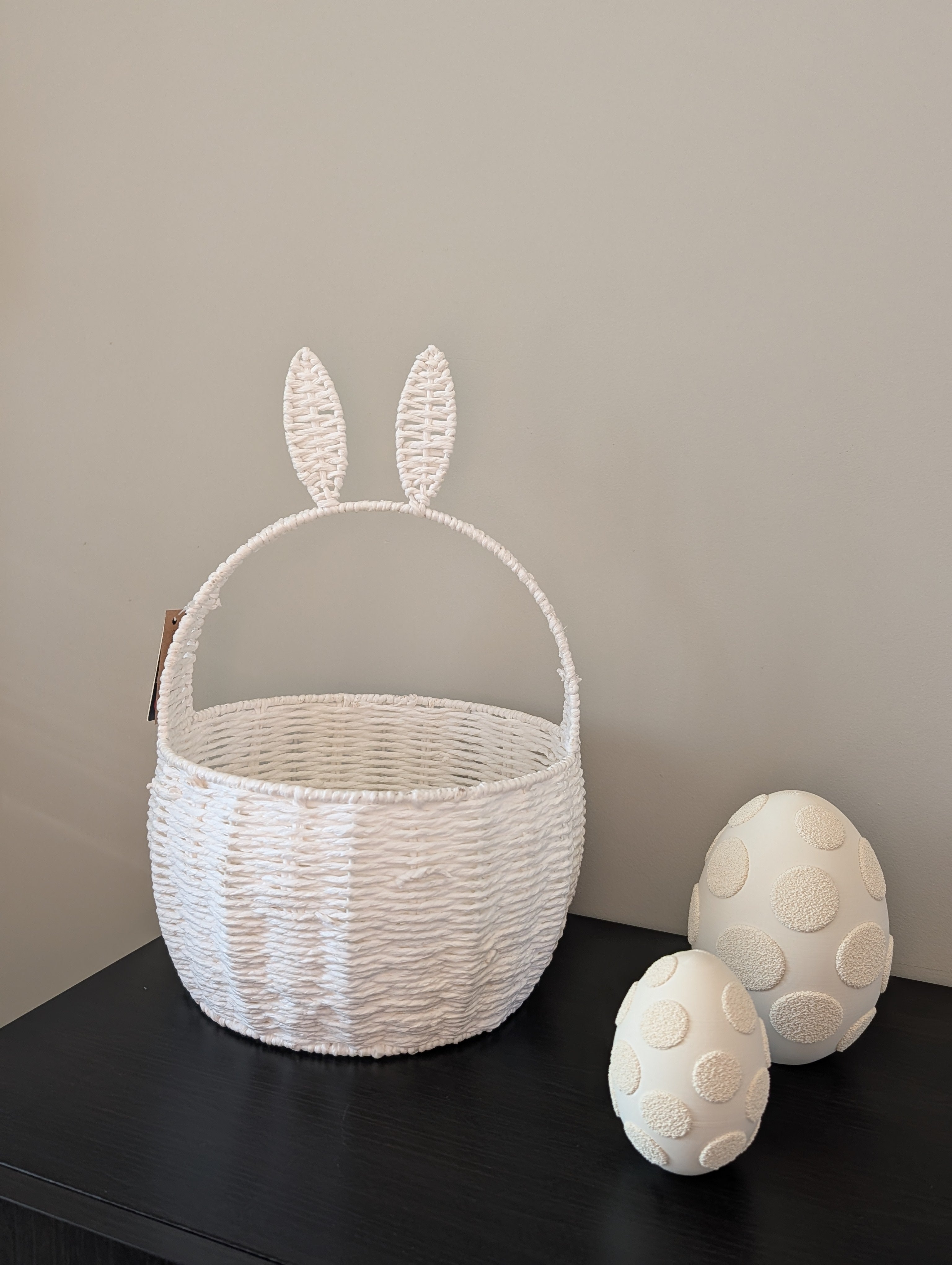 Deze charmante witte mand met speelse konijnenoren is de perfecte mix tussen praktisch en decoratief. Ideaal voor een vrolijk paasfeest of als stijlvolle opberger in de kinderkamer.