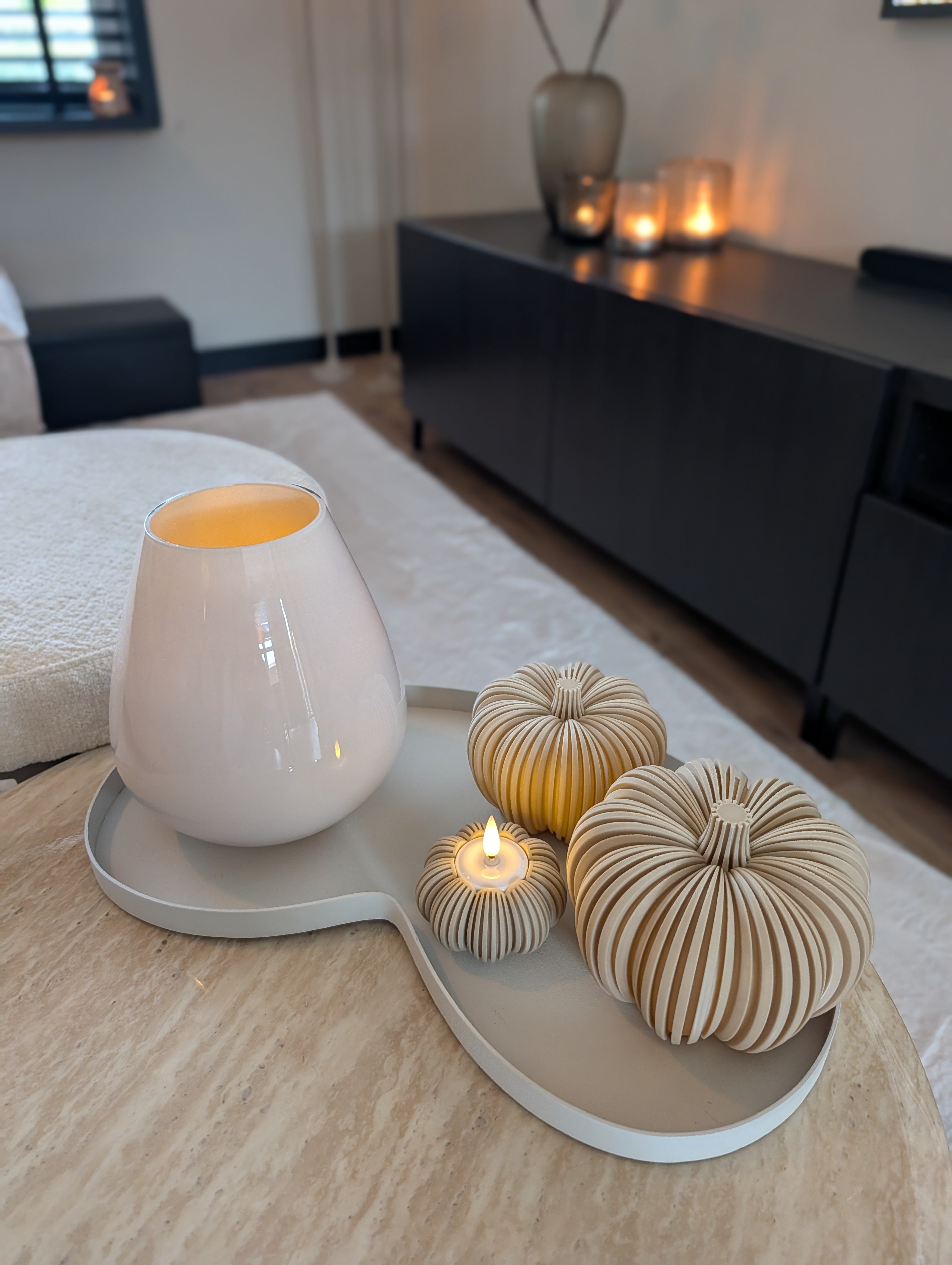 Modern Herfstthema: Het gestructureerde pompoen- of bloemdesign met de fijne, ribbelige lijnen zorgt voor een eigentijdse en stijlvolle interpretatie van herfstdecoratie. De lichte, neutrale kleur past moeiteloos in elk interieur.