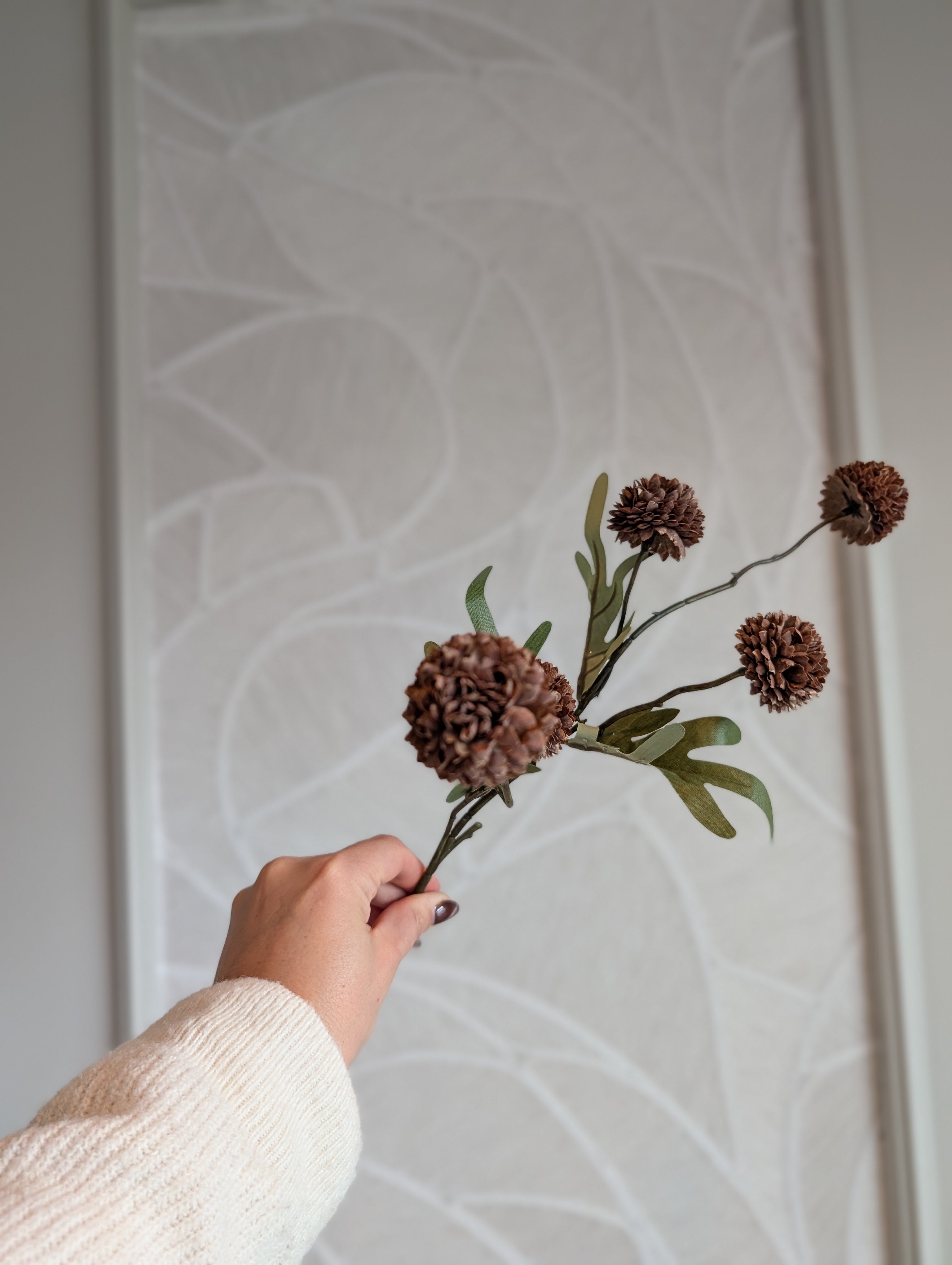 Breng direct warmte en textuur in je interieur met deze decoratieve pompom tak. De tak is 50 cm lang en voorzien van vijf sfeervolle, bruine bloembollen en natuurgetrouwe blaadjes. Perfect voor een smalle vaas of als speels accent in een (droog)boeket.