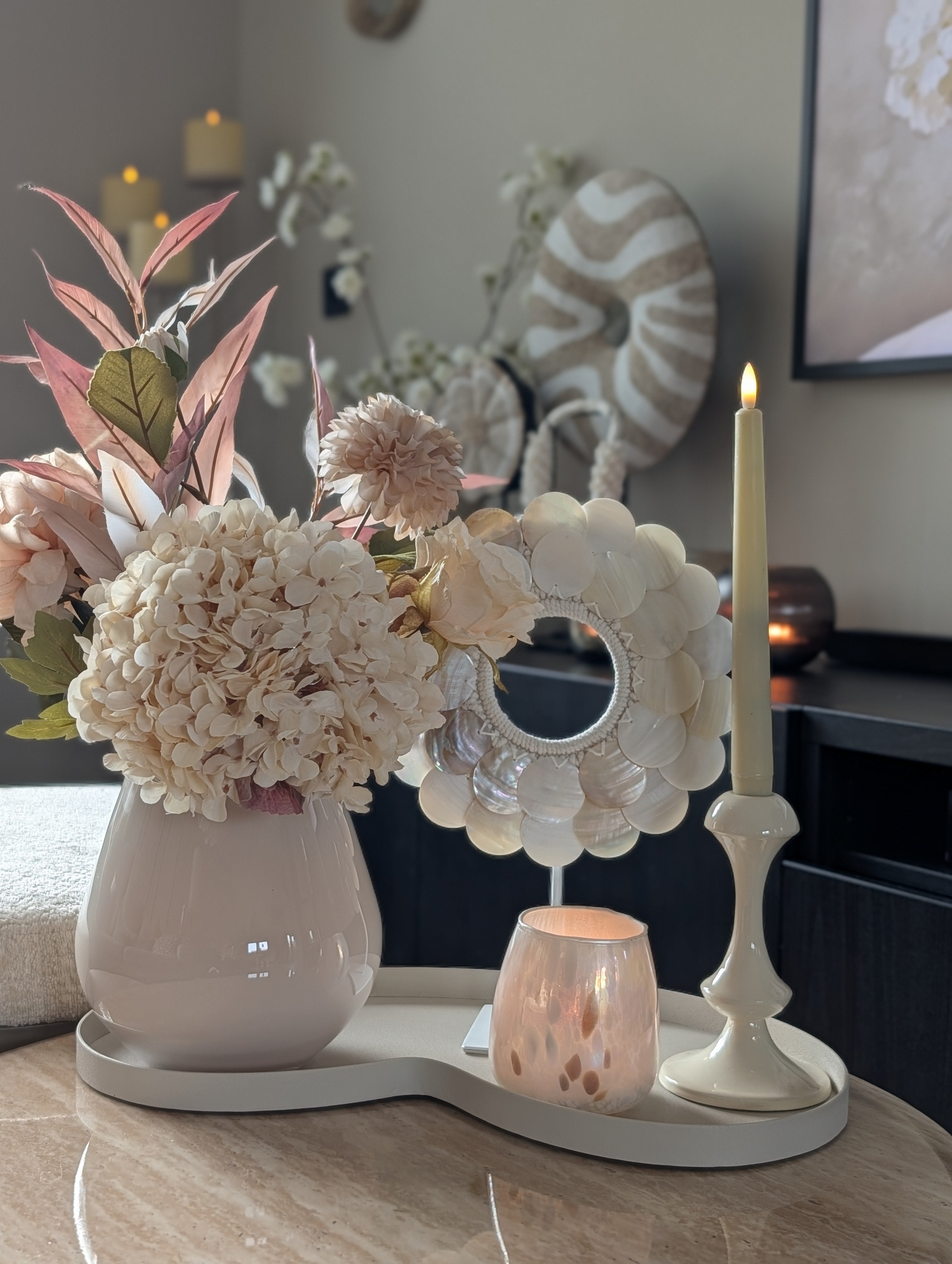 Stijlvol contrast: De combinatie van de zachte schelpen en de strakke, witte standaard zorgt voor een tijdloos design.