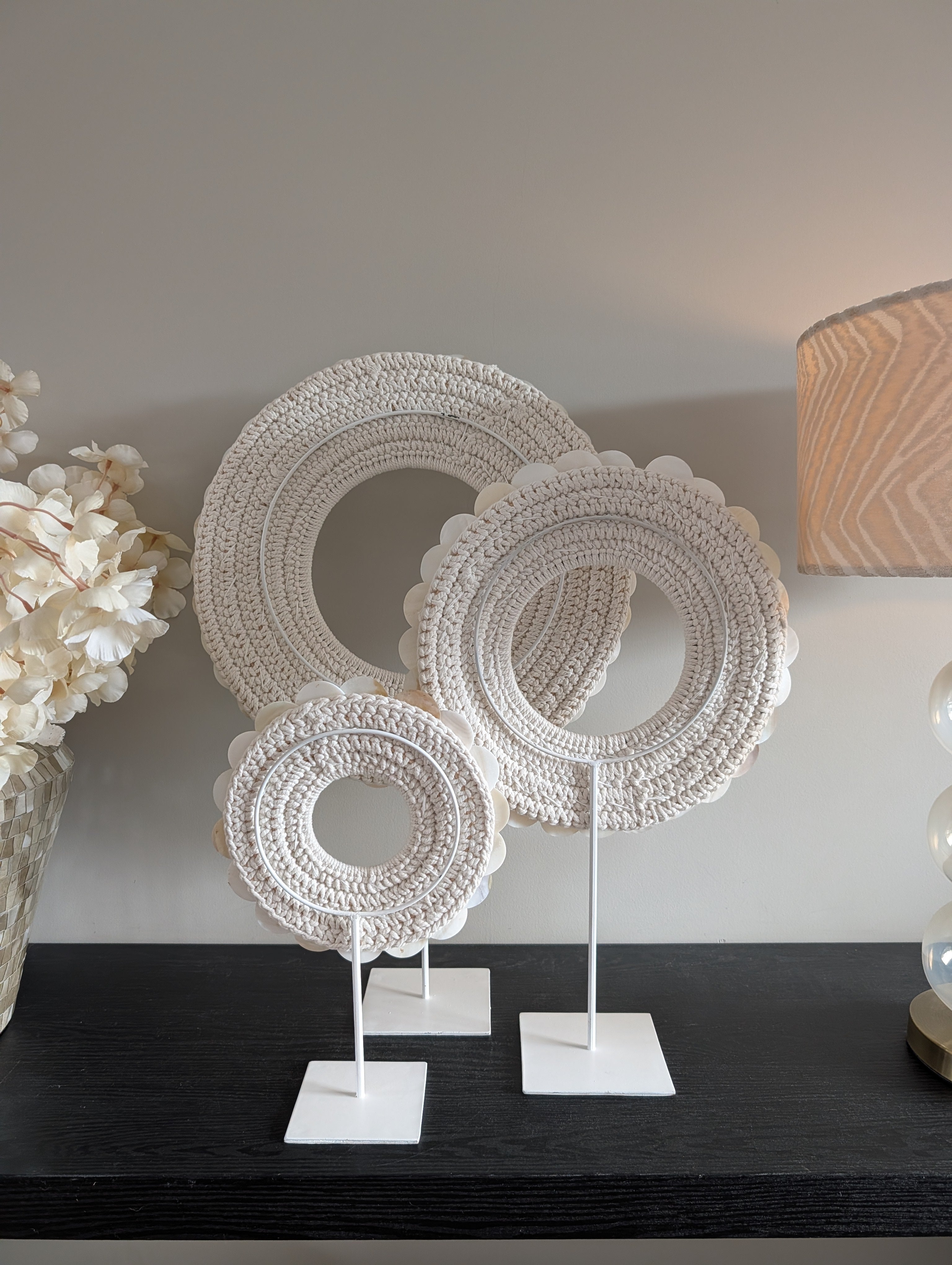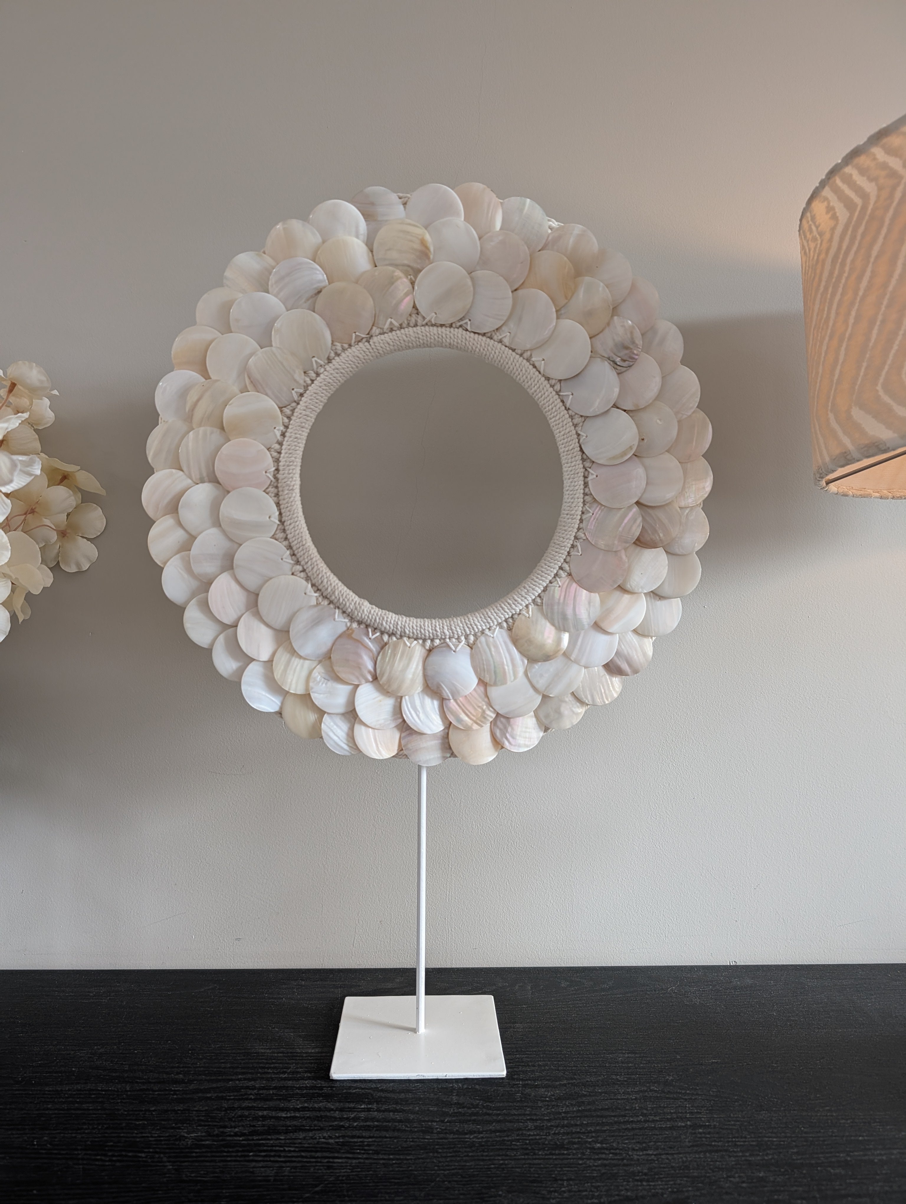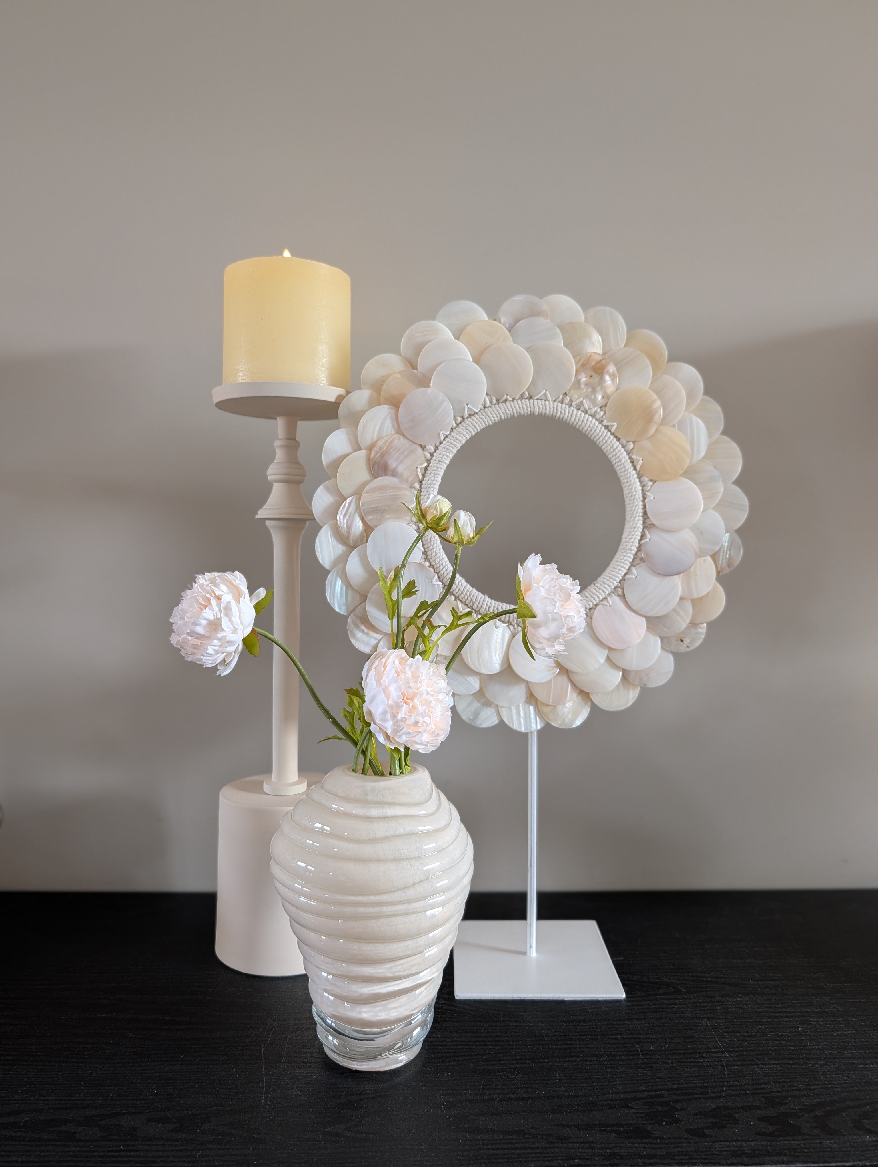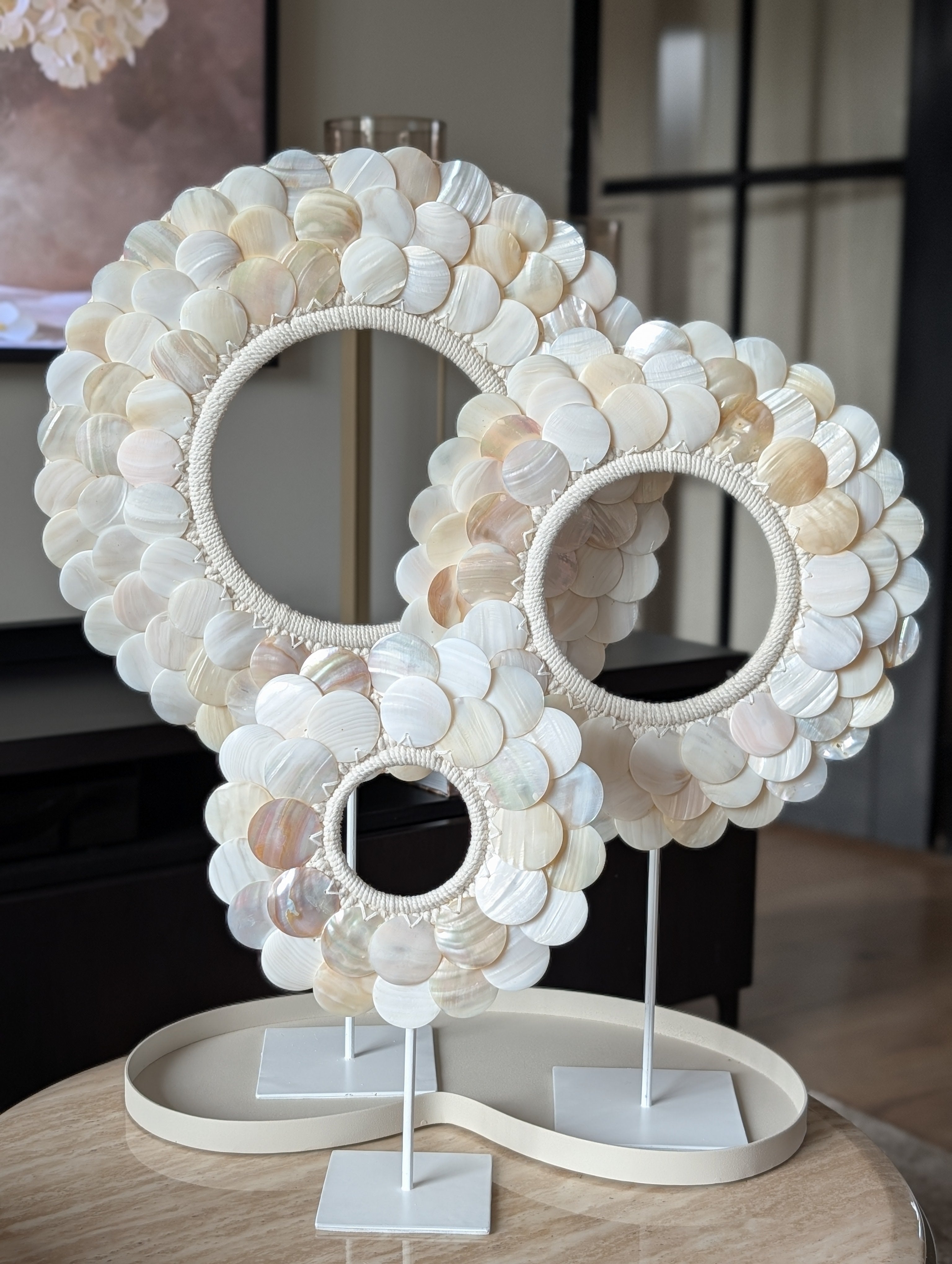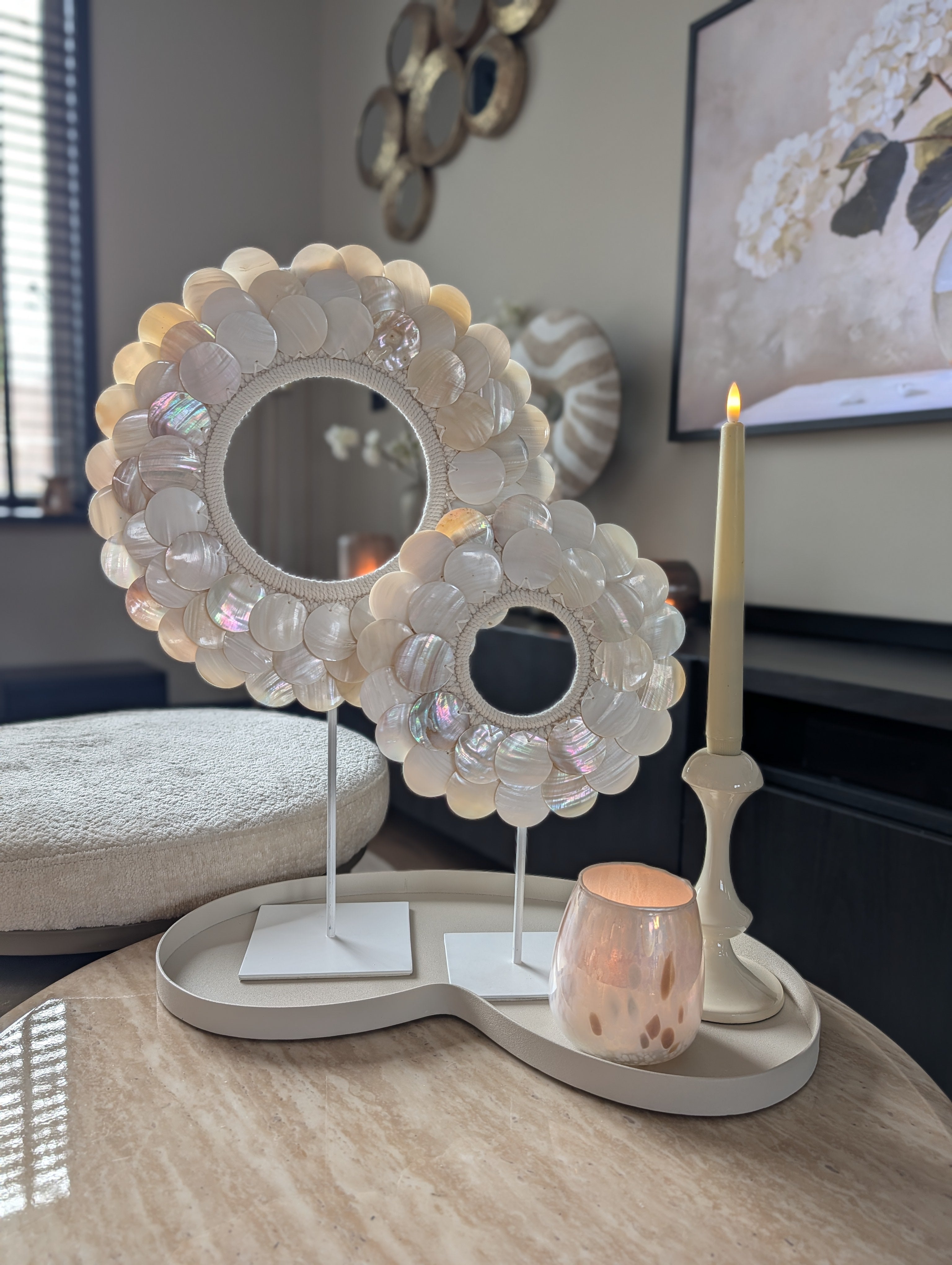 Geef je interieur een serene en luxe uitstraling met deze handgemaakte schelpen ornamenten. Elk stuk is een uniek kunstwerk, opgebouwd uit talloze iriserende schelpen die met zorg zijn bevestigd op een verfijnde, wit omwikkelde ring. De subtiele parelmoerglans vangt het licht prachtig op, waardoor het ornament een echte blikvanger is op een dressoir, in een vakkenkast of op de vensterbank.