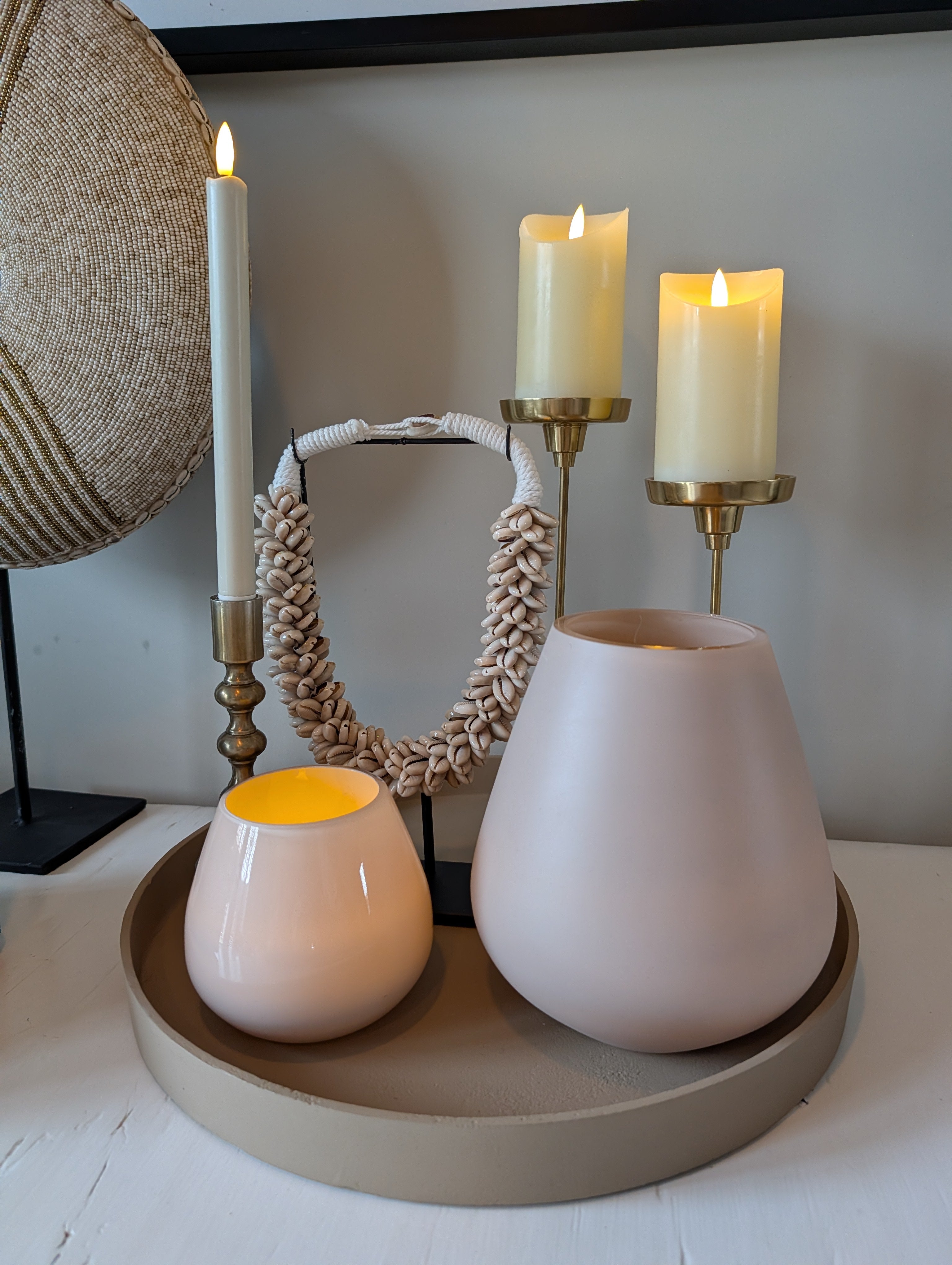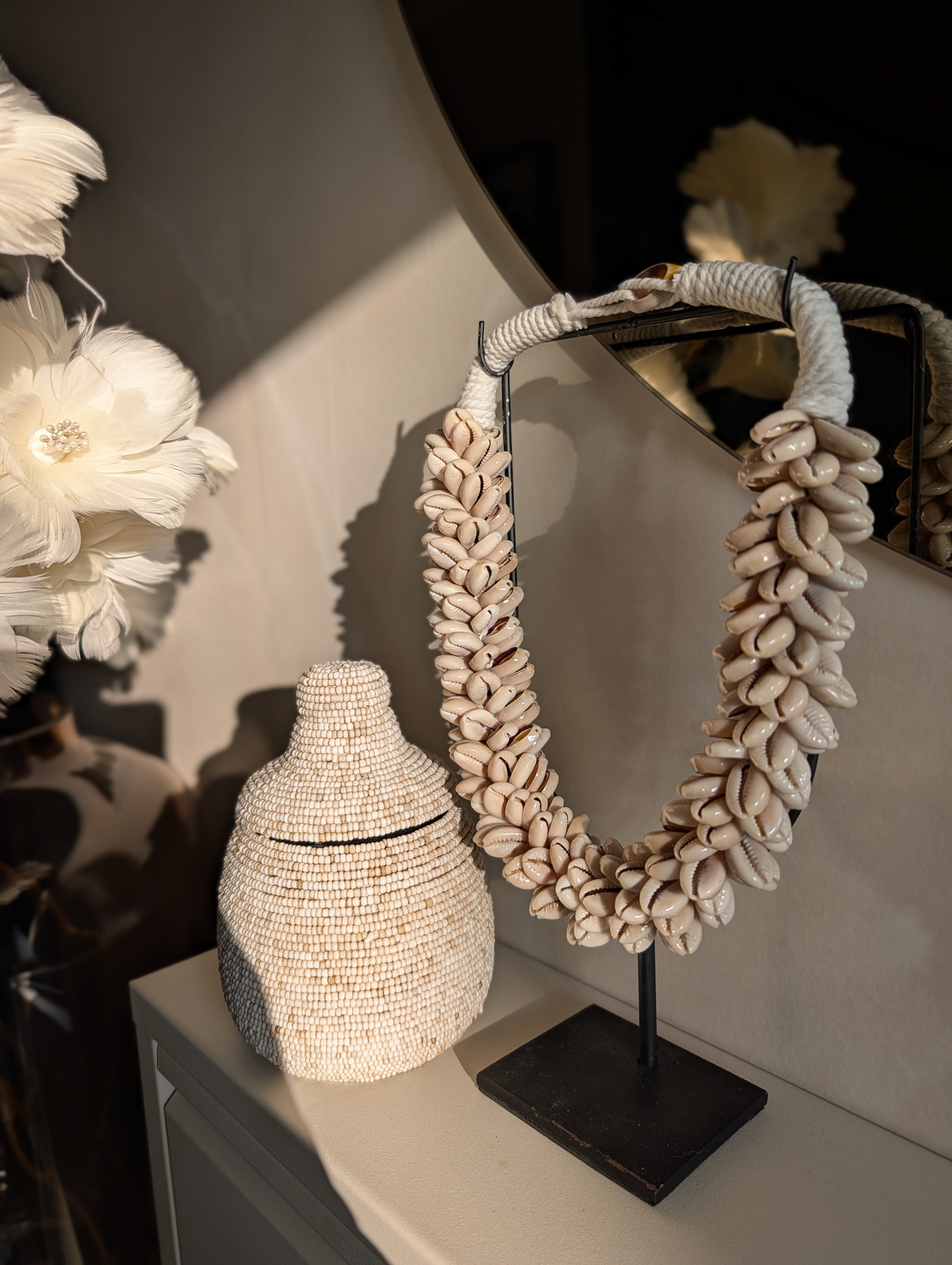 Breng een serene, bohemian sfeer in huis met dit prachtige handgemaakte object. Dit unieke ornament, vervaardigd uit zorgvuldig geselecteerde cowrie schelpen in een zachte beige tint, is een echte blikvanger in elk interieur. De schelpen zijn met de hand bevestigd op een stevig katoenen koord en worden gepresenteerd op een elegant zwart metalen frame.