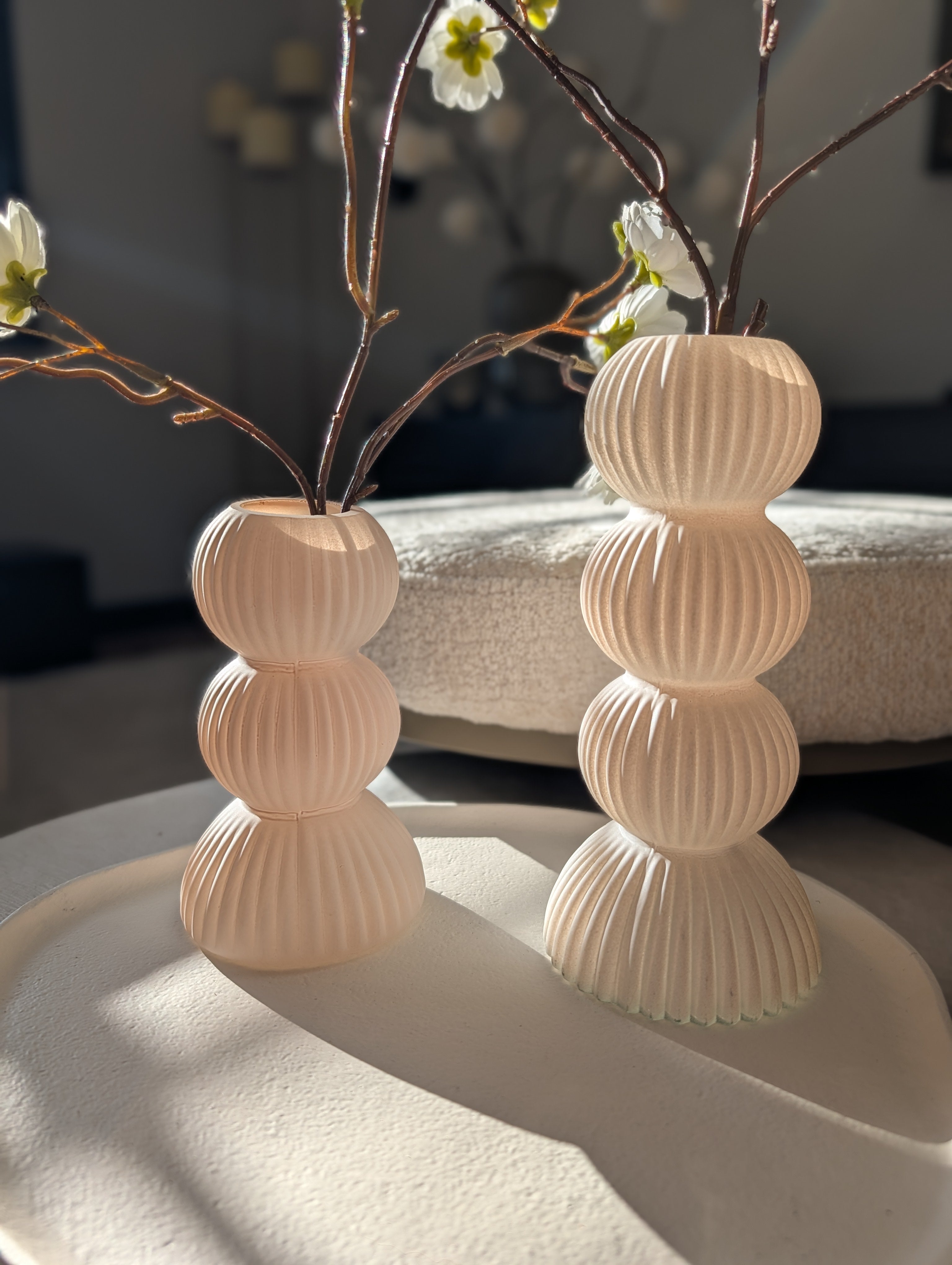 Stylingtip: De vazen komen het beste tot hun recht met een subtiele bloesemtak of droogbloemen.