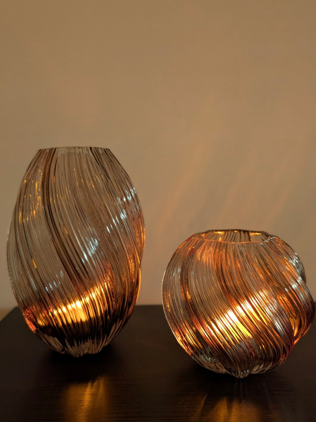 Gemaakt van hoogwaardig glas, heeft de vaas een uniek, taupekleurig design met een opvallend geribbeld patroon dat het licht op een subtiele manier vangt en weerkaatst.