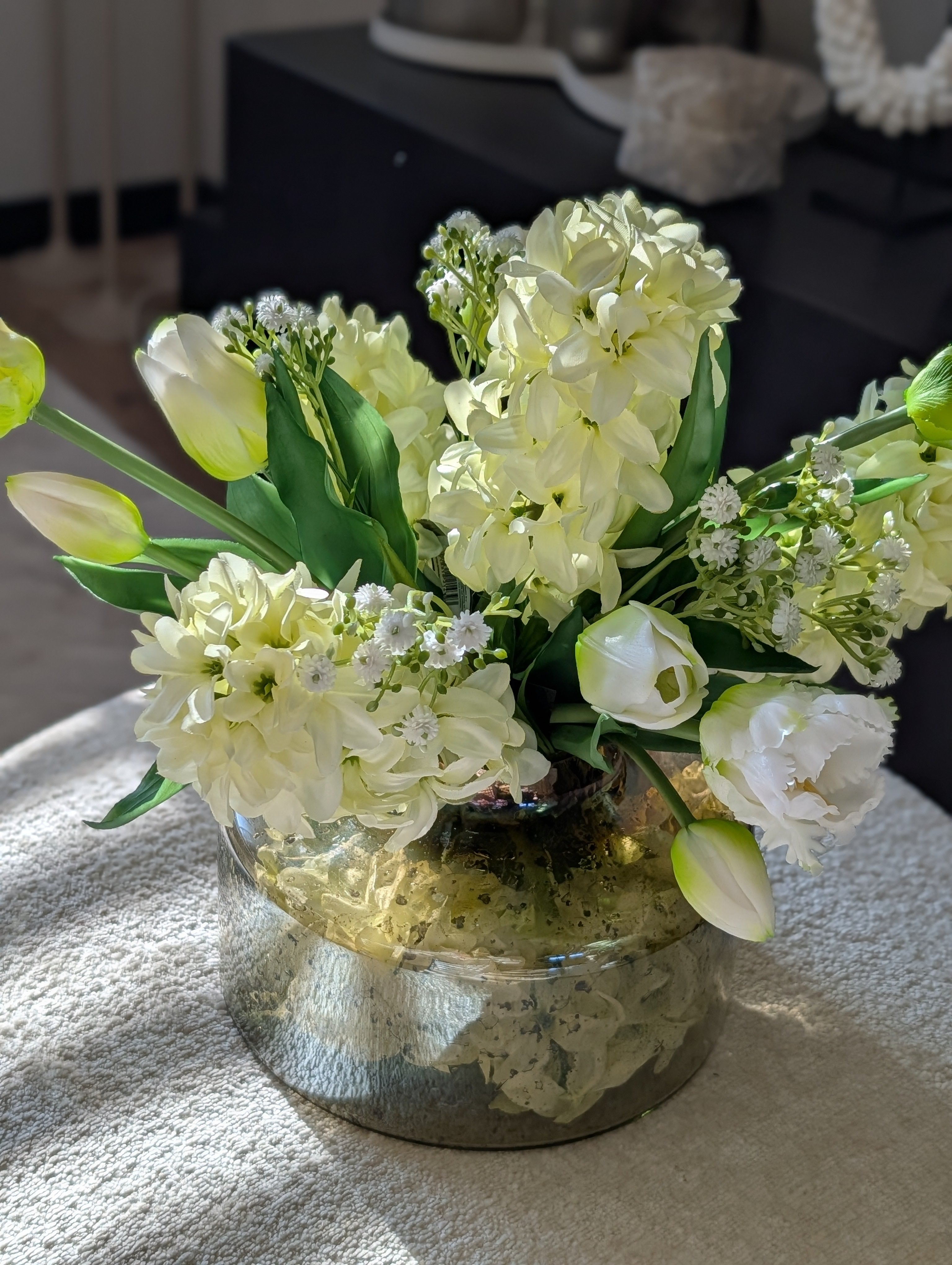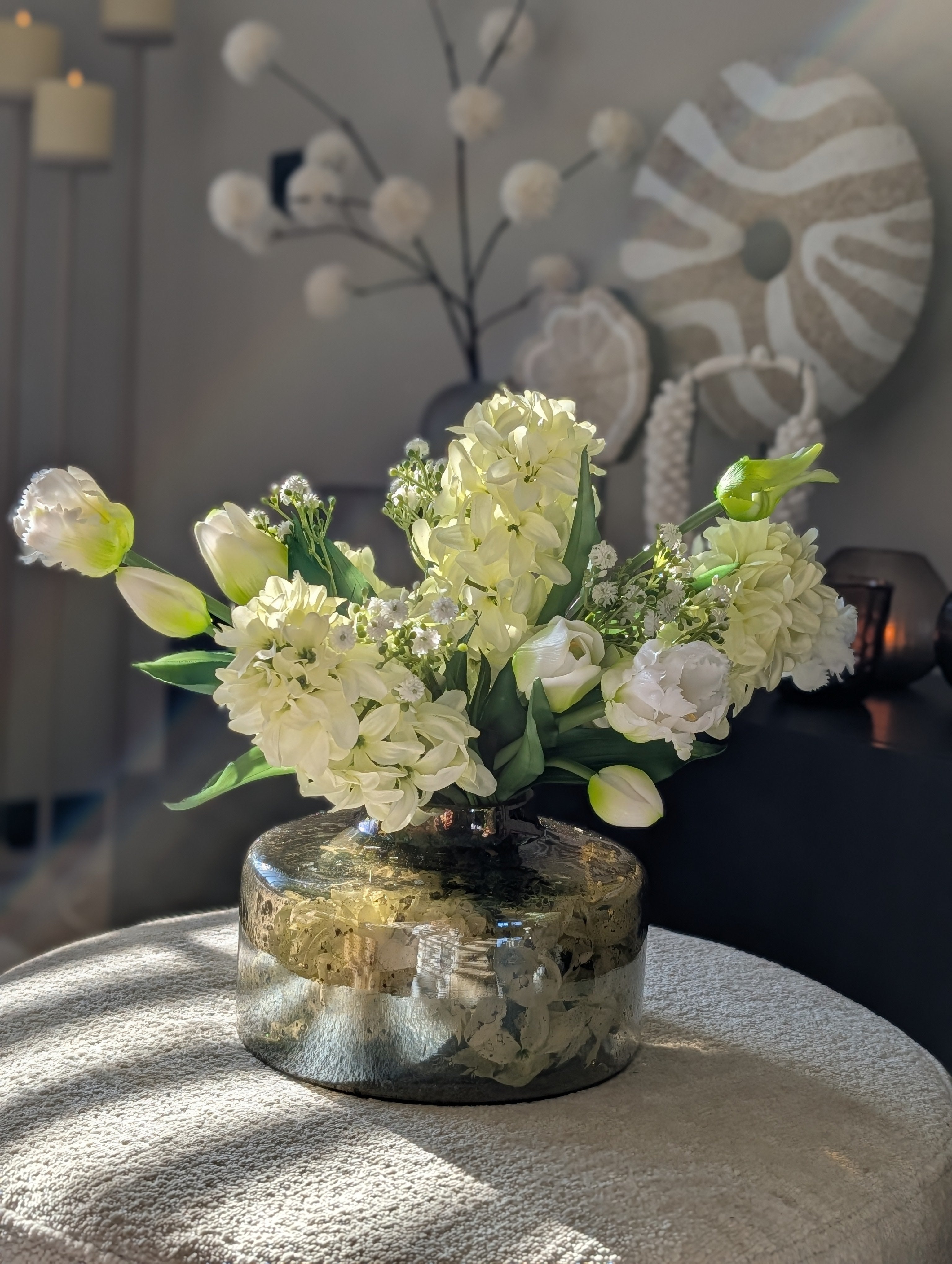 Styling tip: Zoals op de foto te zien is, combineren witte hyacinten en tulpen prachtig met de warme tinten van het glas voor een frisse, chique look!