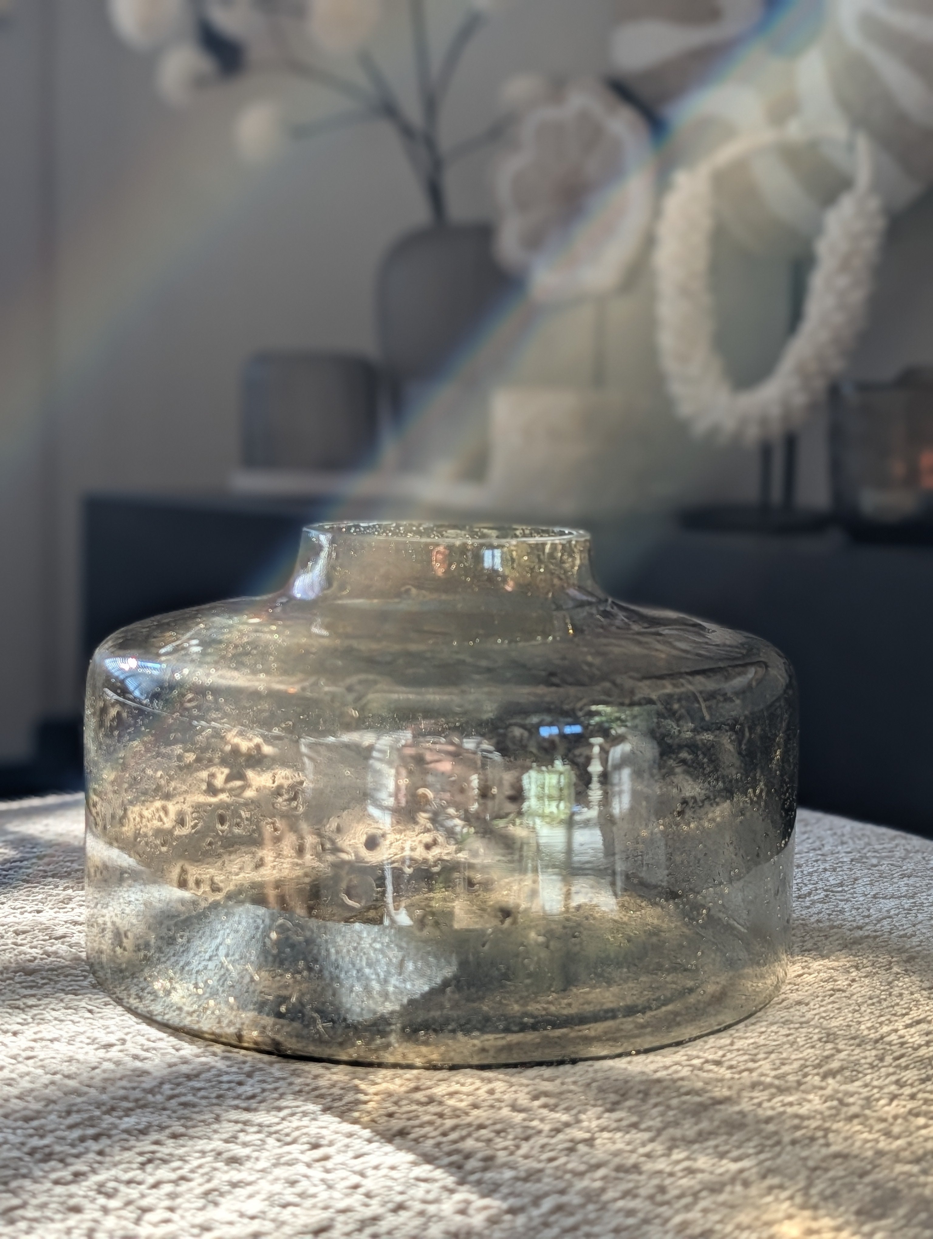 Geef je interieur een luxe upgrade met deze prachtige glazen vaas. De vaas heeft een unieke 'champagne smoke' afwerking, wat zorgt voor een warme, mysterieuze gloed wanneer het licht erop valt. Dankzij de brede, ronde vorm en de smalle opening is deze vaas perfect voor zowel een vol boeket als een paar losse zijden bloemen.