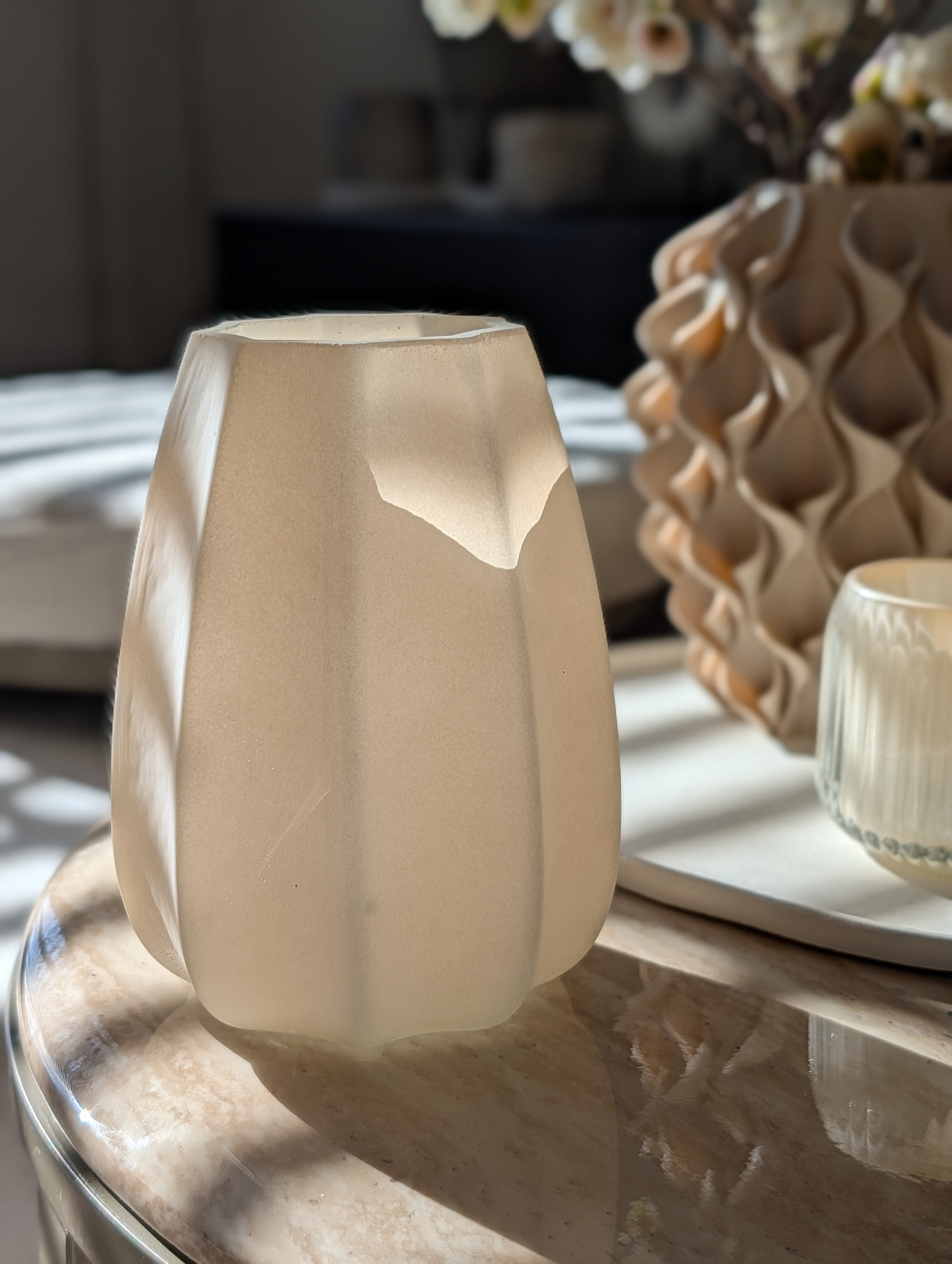 Organische vorm: De subtiele verticale lijnen geven het vaasje een eigentijdse, sculpturale uitstraling die direct in het oog springt op een salontafel, dressoir of dienblad.