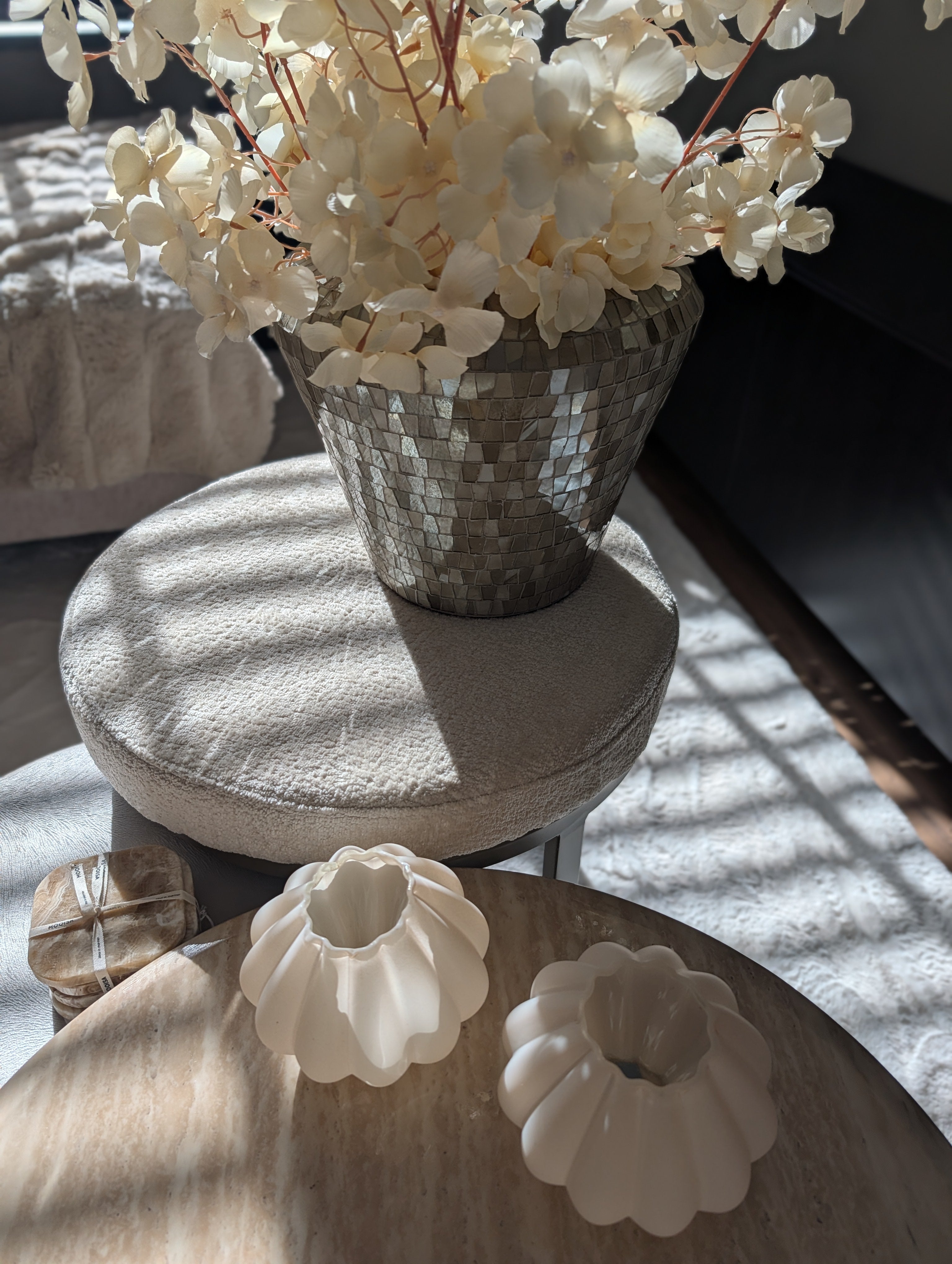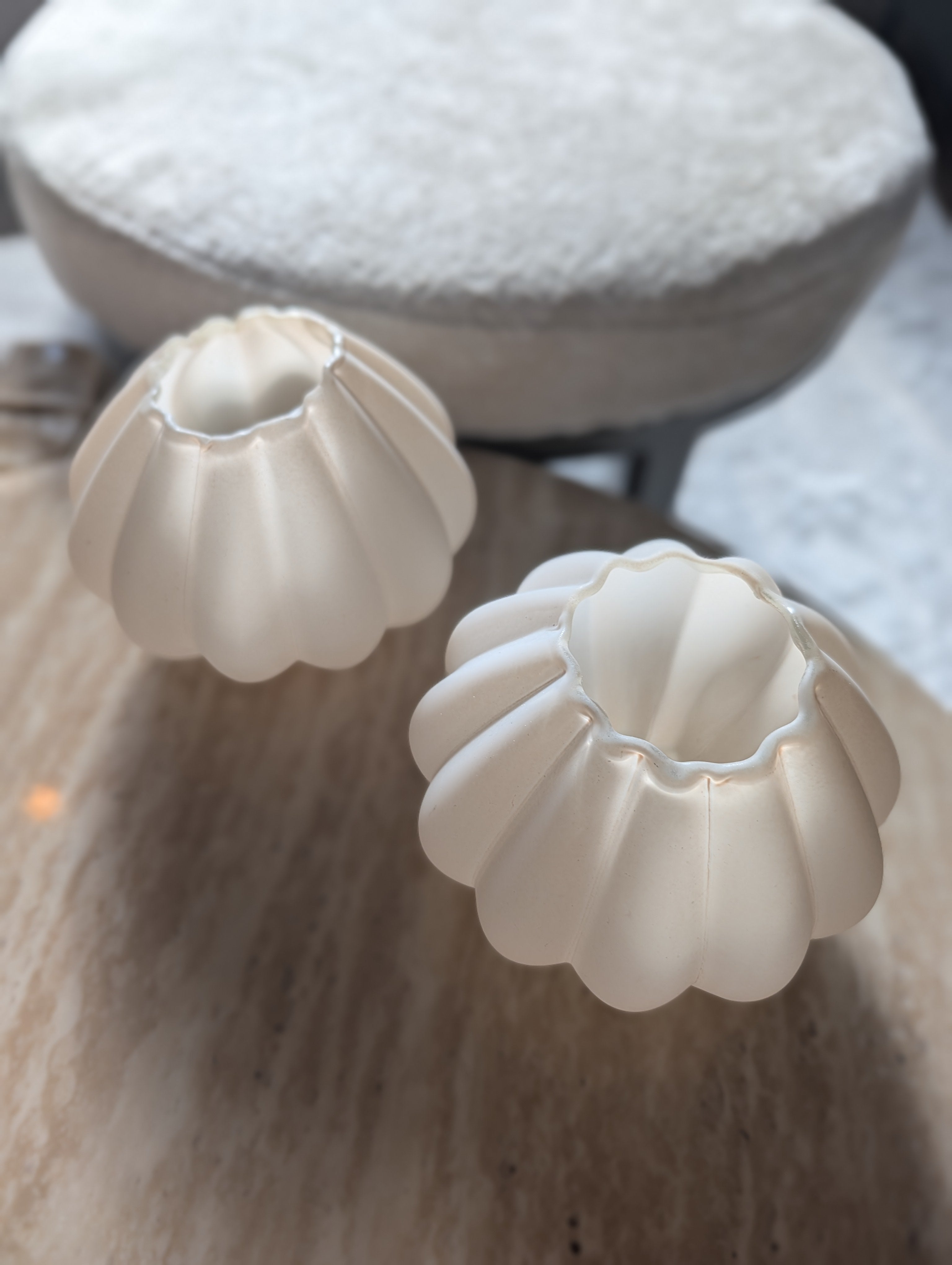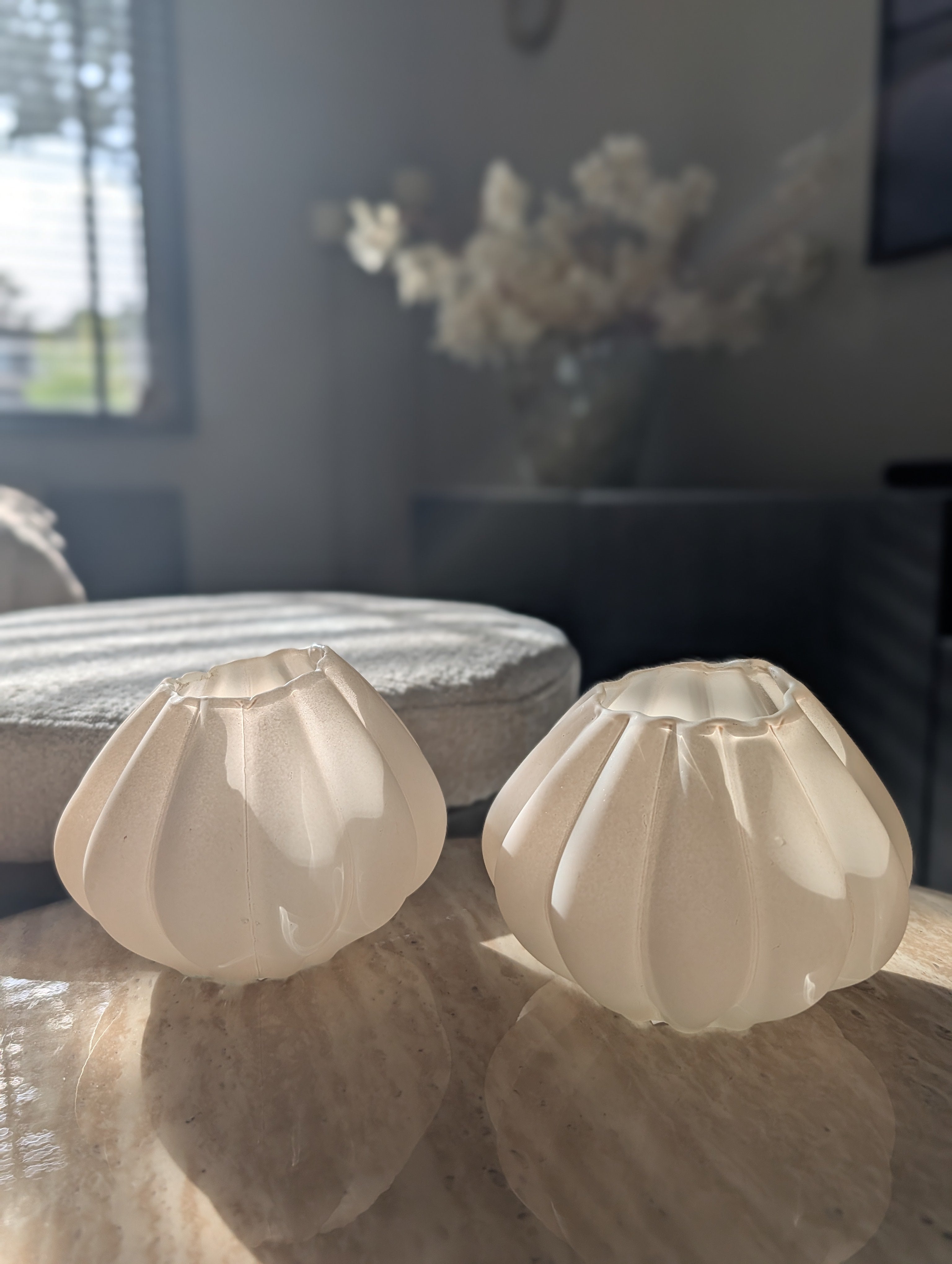 Design: Vervaardigd uit mat crèmekleurig glas met een elegant geribbelde, bloemachtige vorm.